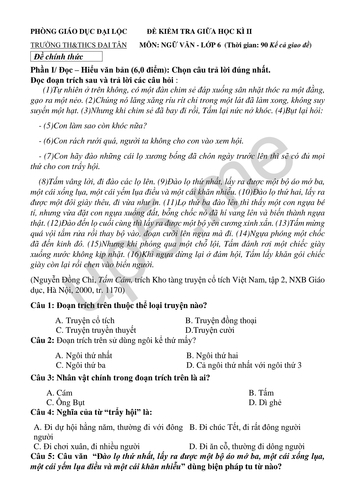 TRƯỜNG TH&THCS ĐẠI TÂN MÔN: NGỮ VĂN - LỚP 6 (Thời gian: 90 Kể cả giao đề)