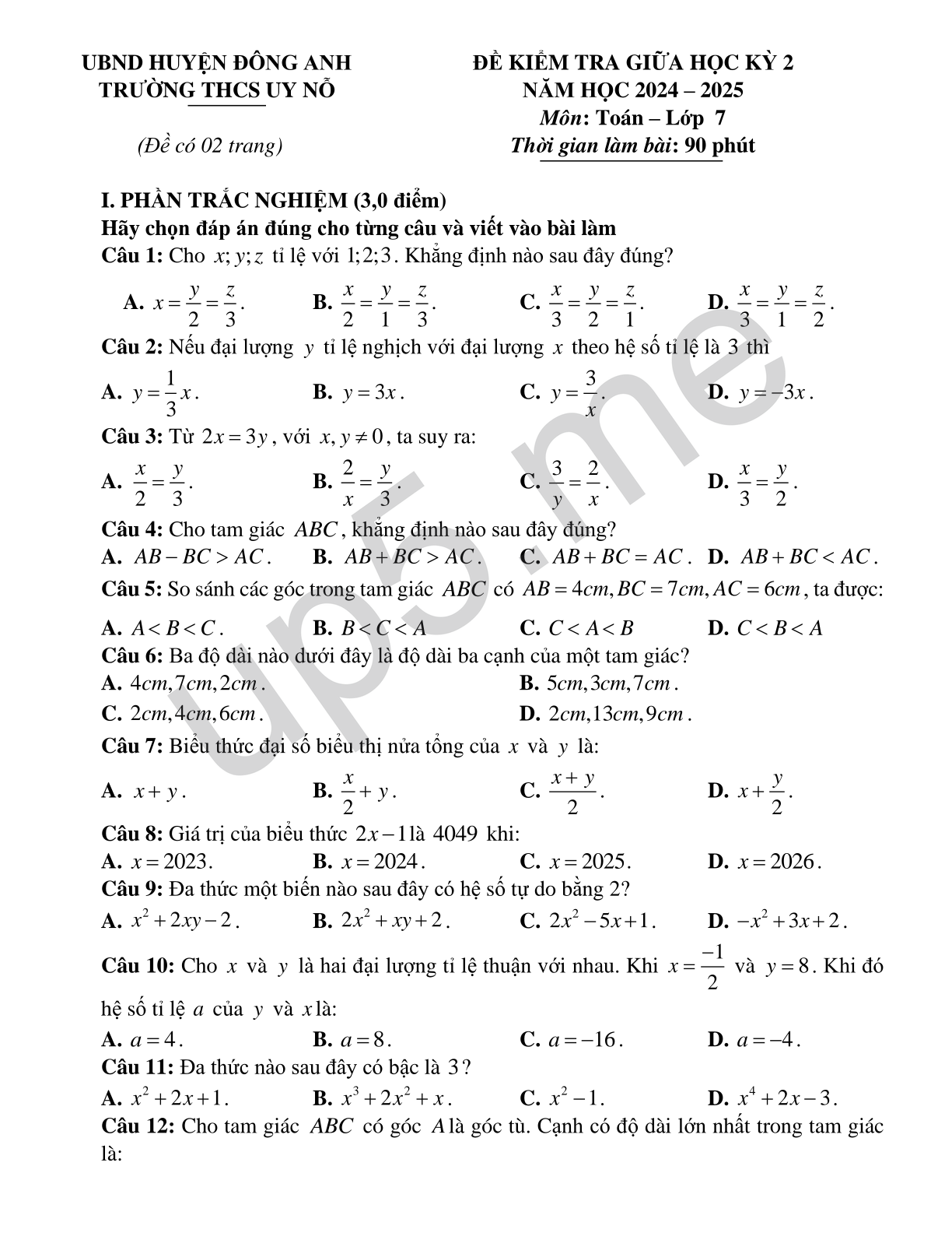 | UBND HUYỆN ĐÔNG ANHTRƯỜNG THCS UY NỖ(Đề có 02 trang) | ĐỀ KIỂM TRA GIỮA HỌC KỲ 2NĂM HỌC 2024 – 2025Môn: Toán – Lớp 7 Thời gian làm bài: 90 phút |