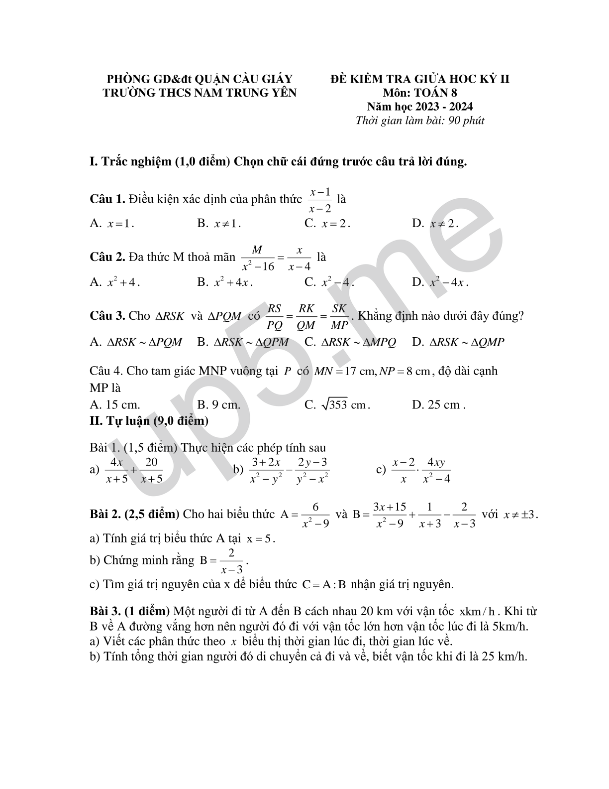 ĐỀ KIỂM TRA GIỮA HỌC KẎ II Môn: TOÁN 8 Năm học 2023 - 2024 Thời gian làm bài: 90 phút |