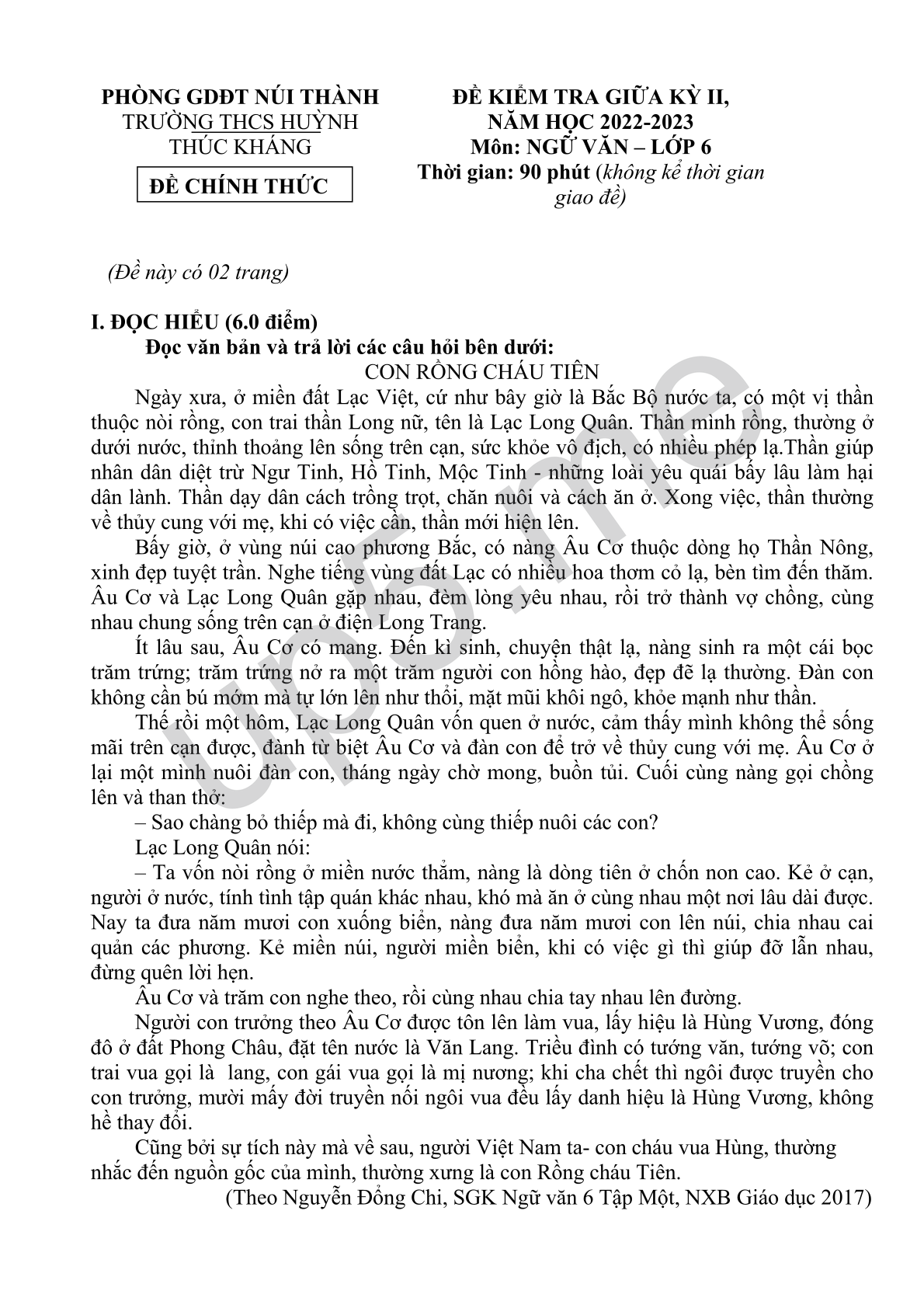 ĐỀ KIỂM TRA GIỮA KỲ II, NĂM HỌC 2022-2023 Môn: NGỮ VĂN – LỚP 6 Thời gian: 90 phút (không kể thời gian giao đề) |