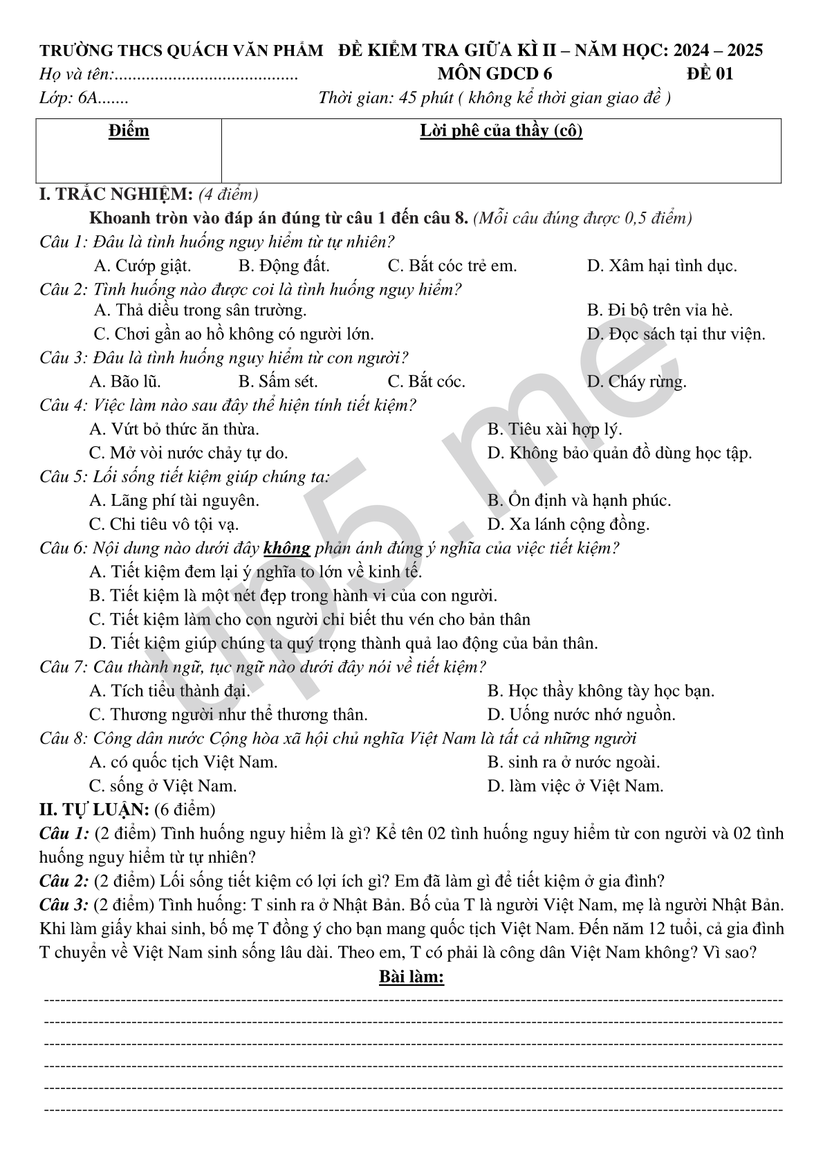 Họ và tên:......................................... MÔN GDCD 6 ĐỀ 01