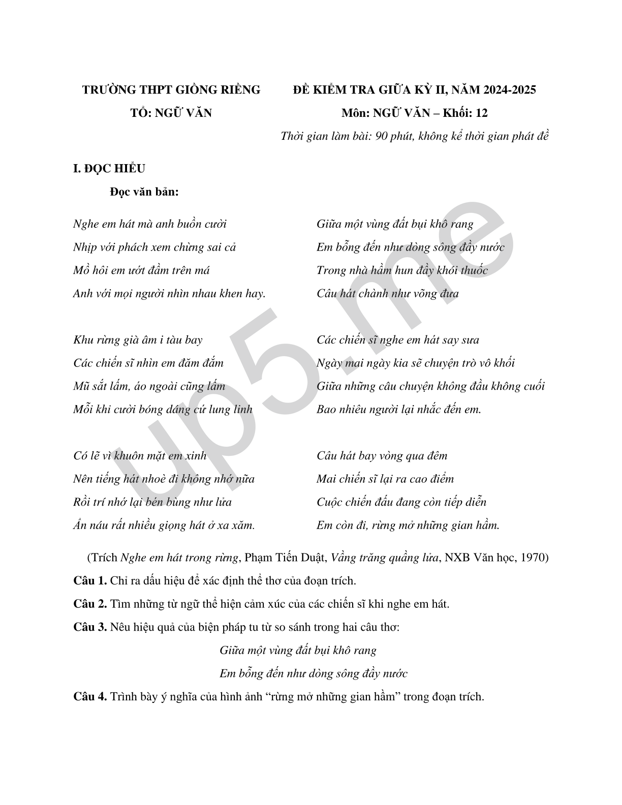 ĐỀ KIỂM TRA GIỮA KỲ II, NĂM 2024-2025Môn: NGỮ VĂN – Khối: 12Thời gian làm bài: 90 phút, không kể thời gian phát đề |