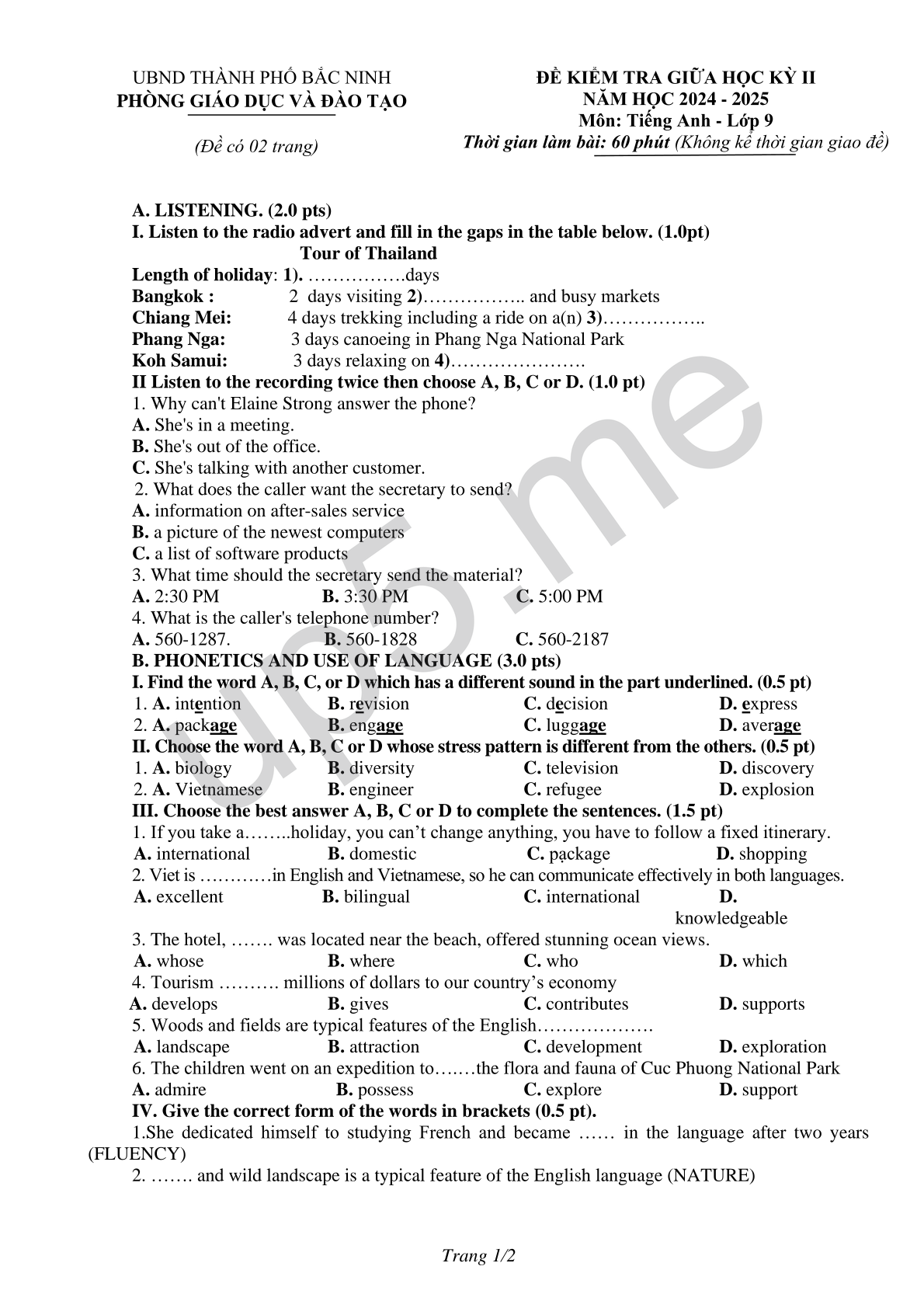 A. LISTENING. (2.0 pts)