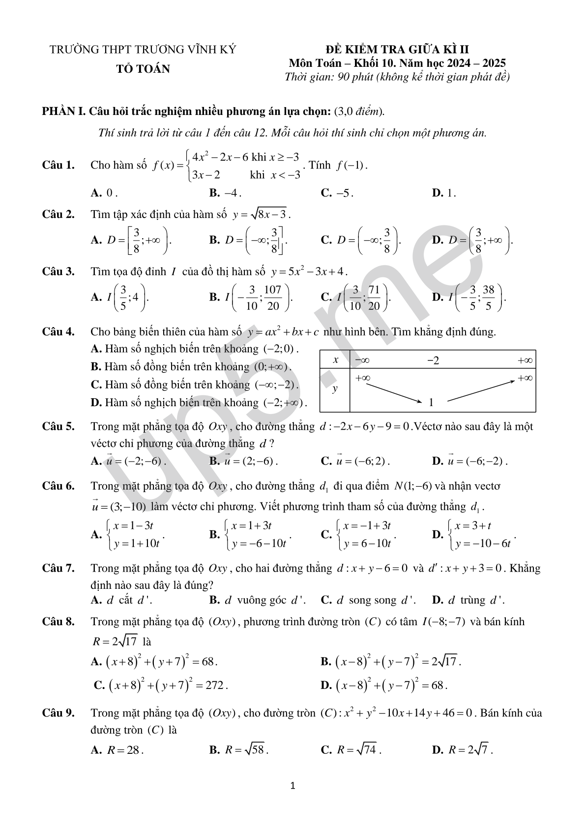 ĐỀ KIỂM TRA GIỮA KÌ IIMôn Toán – Khối 10. Năm học 2024 – 2025Thời gian: 90 phút (không kể thời gian phát đề) |