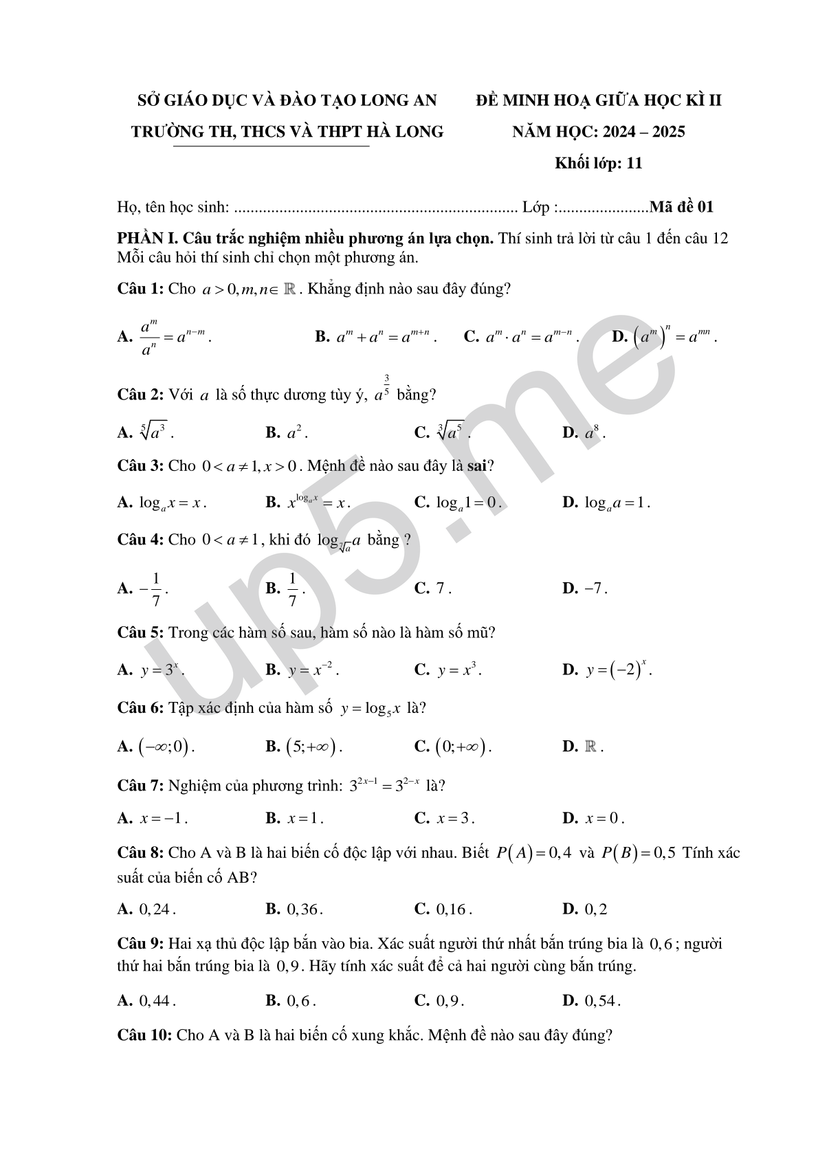 | SỞ GIÁO DỤC VÀ ĐÀO TẠO LONG ANTRƯỜNG TH, THCS VÀ THPT HÀ LONG | ĐỀ MINH HOẠ GIỮA HỌC KÌ IINĂM HỌC: 2024 – 2025Khối lớp: 11 |