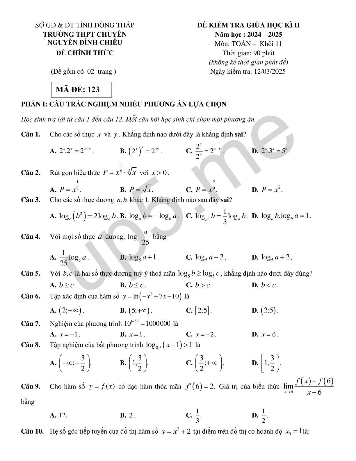 SỞ GD & ĐT TỈNH ĐỒNG THÁP TRƯỜNG THPT CHUYÊN NGUYỄN ĐÌNH CHIỂU ĐỀ CHÍNH THỨC (Đề gồm có 02 trang ) MÃ ĐỀ: 123 |
