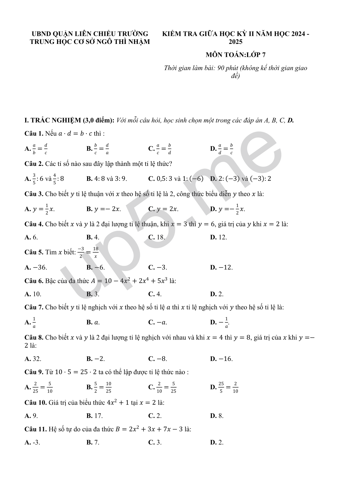 KIỂM TRA GIỮA HỌC KỲ II NĂM HỌC 2024 - 2025MÔN TOÁN: LỚP 7 Thời gian làm bài: 90 phút (không kể thời gian giao đề) |