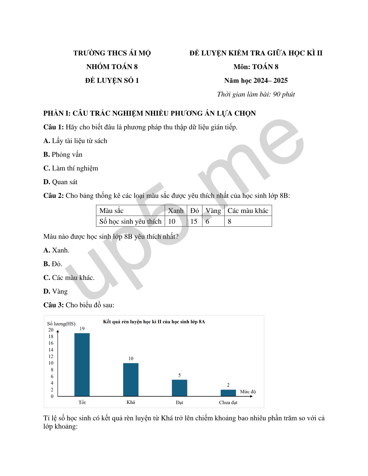 | TRƯỜNG THCS ÁI MỘNHÓM TOÁN 8ĐỀ LUYỆN SỐ 1 | ĐỀ LUYỆN KIỂM TRA GIỮA HỌC KÌ IIMôn: TOÁN 8Năm học 2024– 2025Thời gian làm bài: 90 phút |