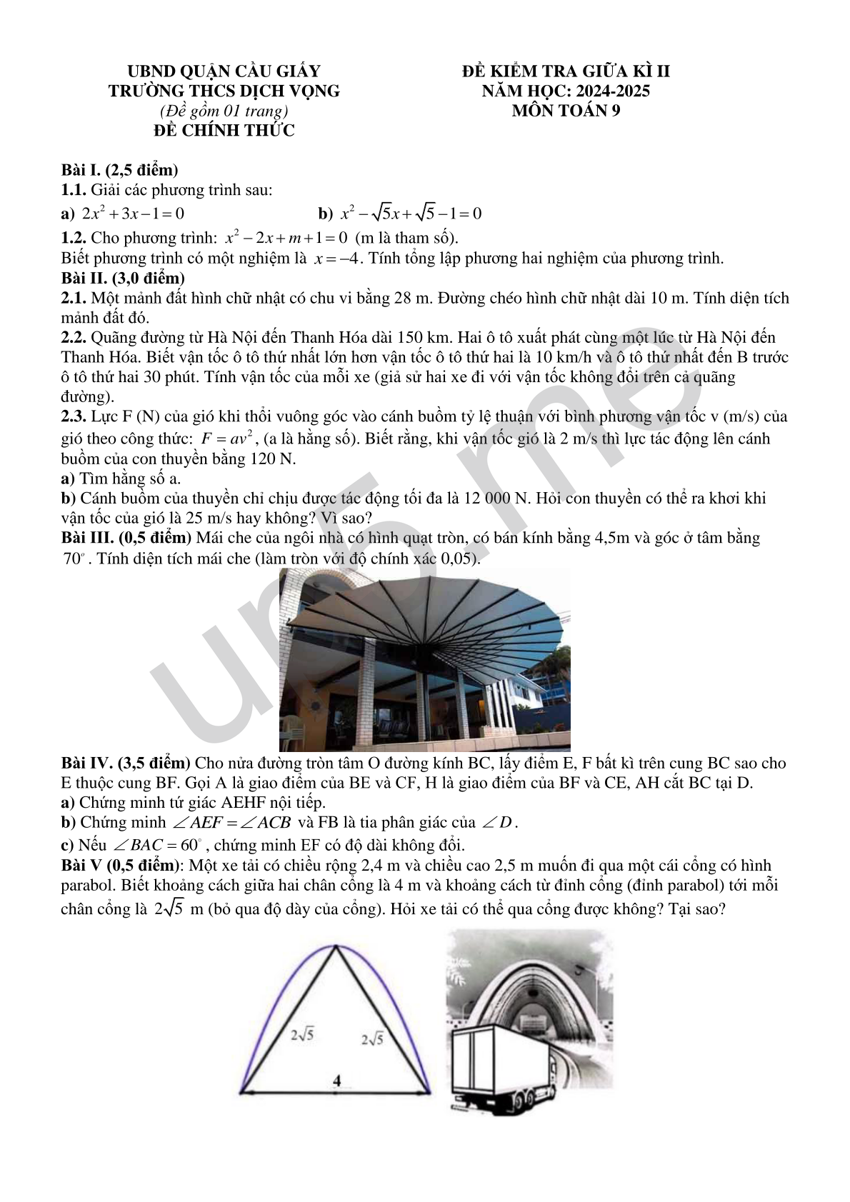 | UBND QUẬN CẦU GIẤYTRƯỜNG THCS DỊCH VỌNG(Đề gồm 01 trang)ĐỀ CHÍNH THỨC | ĐỀ KIỂM TRA GIỮA KÌ IINĂM HỌC: 2024-2025MÔN TOÁN 9 |