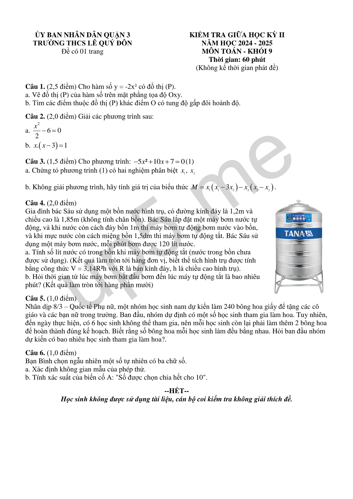 KIỂM TRA GIỮA HỌC KỲ II NĂM HỌC 2024 - 2025 MÔN TOÁN - KHỐI 9 Thời gian: 60 phút (Không kể thời gian phát đề) |