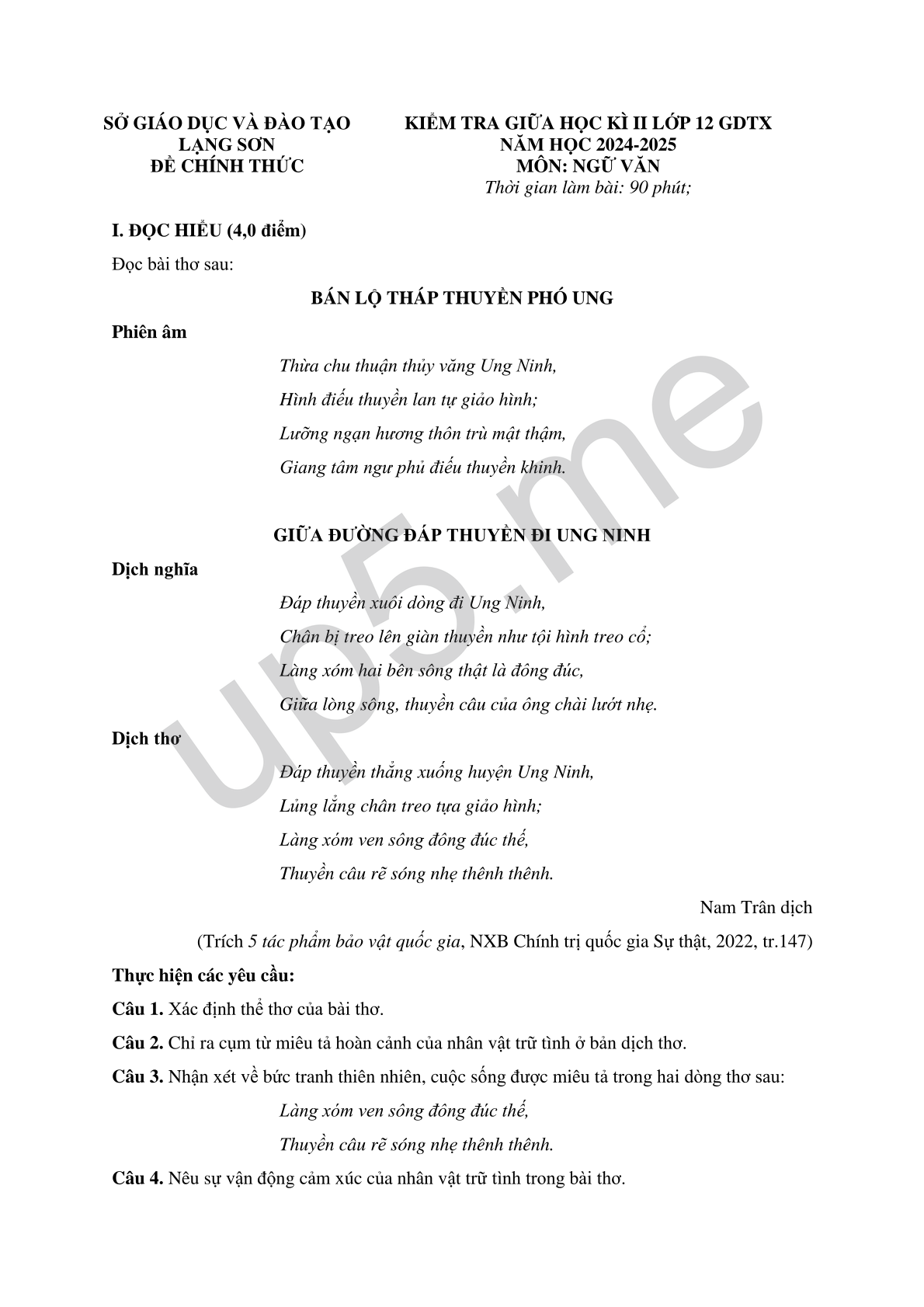 KIỂM TRA GIỮA HỌC KÌ II LỚP 12 GDTXNĂM HỌC 2024-2025MÔN: NGỮ VĂNThời gian làm bài: 90 phút; |