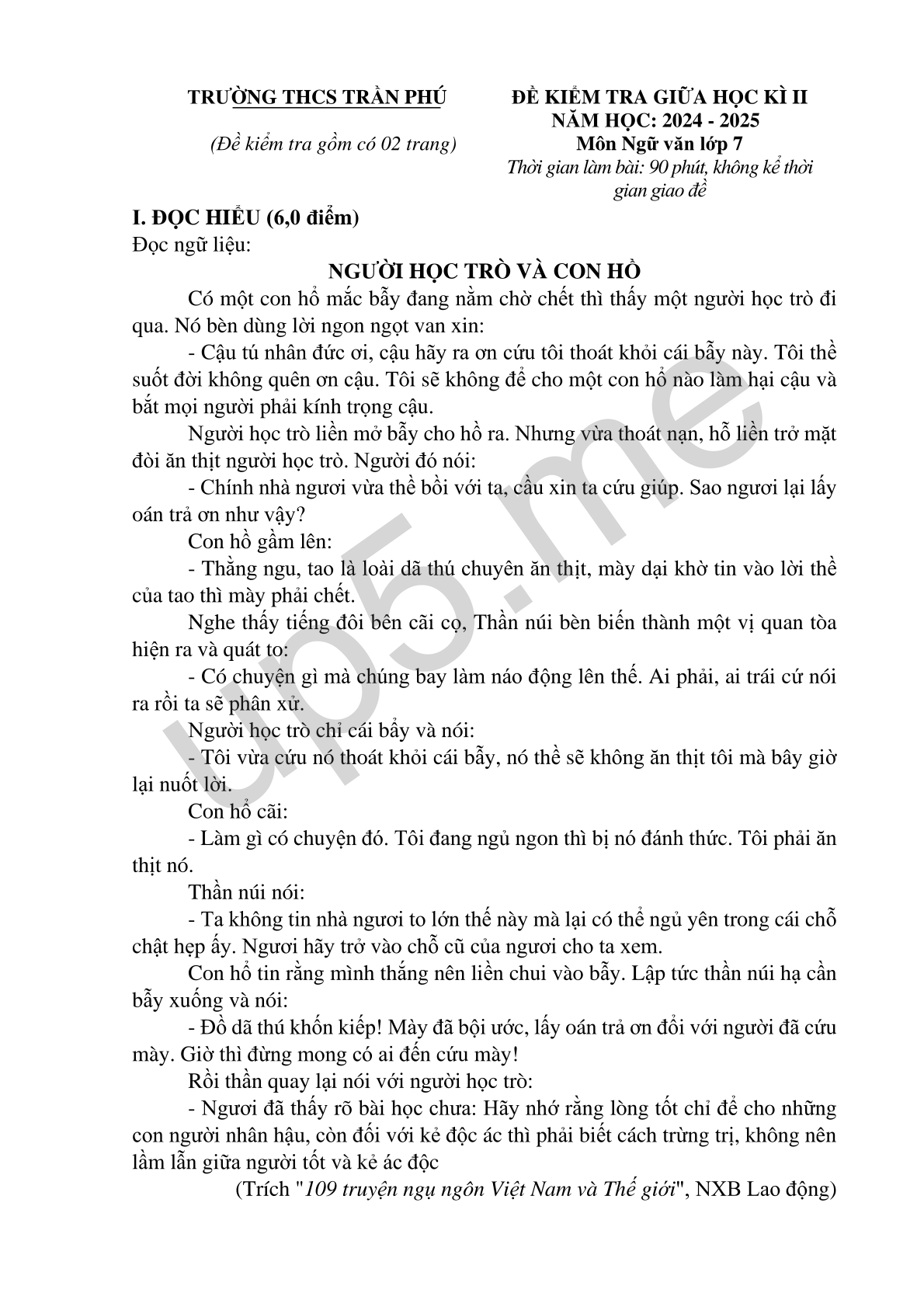 | TRƯỜNG THCS TRẦN PHÚ (Đề kiểm tra gồm có 02 trang) | ĐỀ KIỂM TRA GIỮA HỌC KÌ IINĂM HỌC: 2024 - 2025Môn Ngữ văn lớp 7Thời gian làm bài: 90 phút, không kể thời gian giao đề |