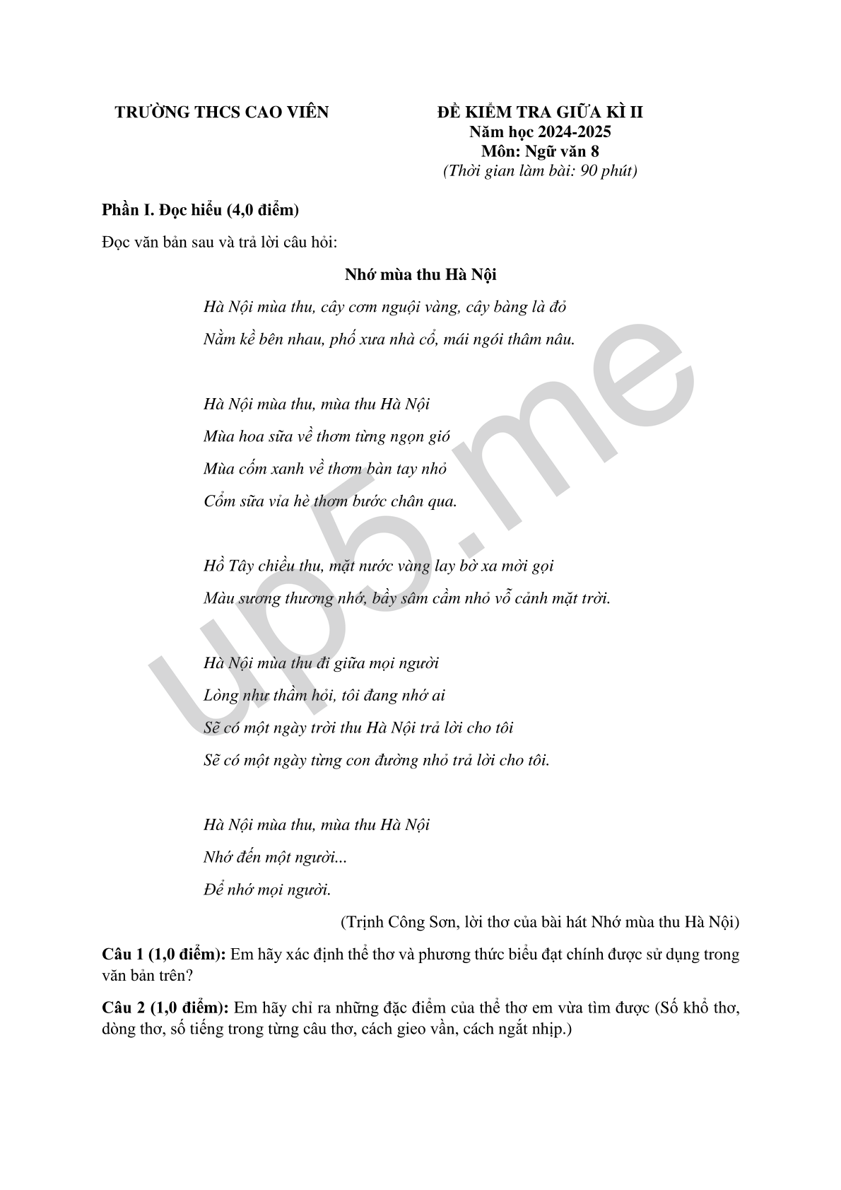 ĐỀ KIỂM TRA GIỮA KÌ IINăm học 2024-2025Môn: Ngữ văn 8(Thời gian làm bài: 90 phút) |