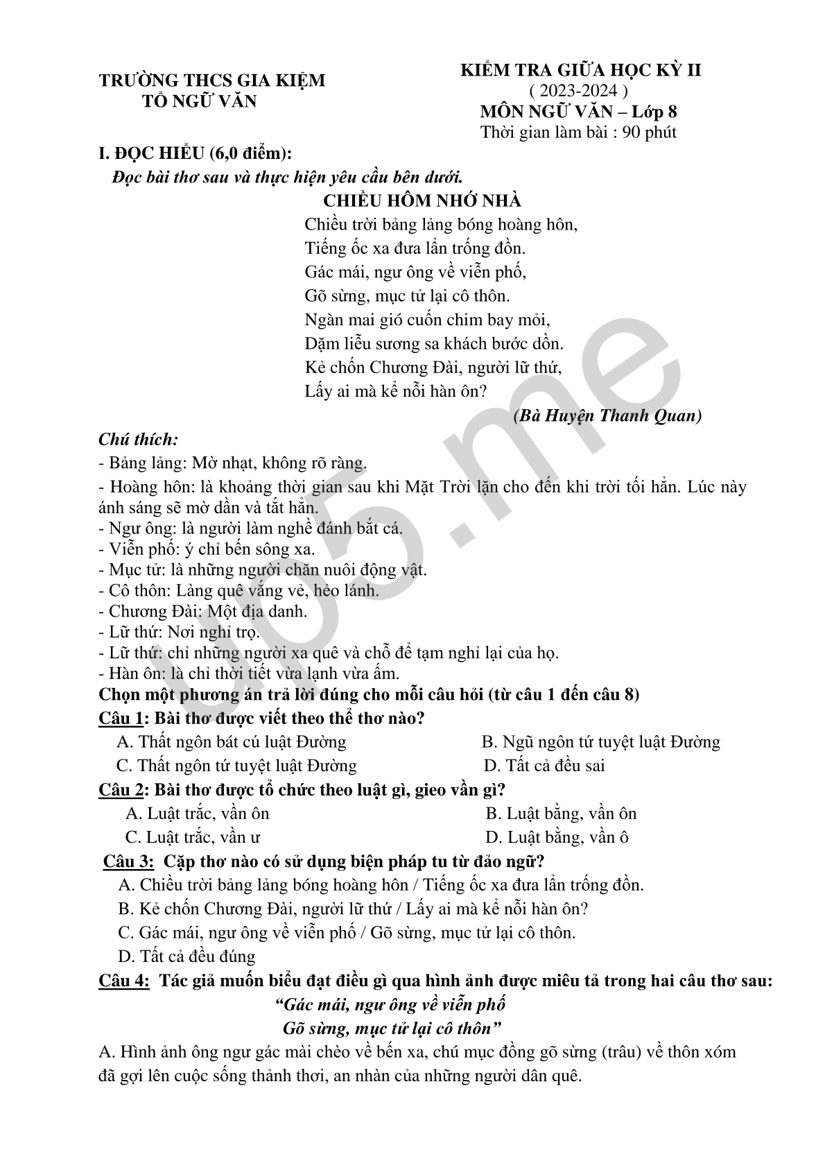 KIỂM TRA GIỮA HỌC KỲ II( 2023-2024 )MÔN NGỮ VĂN – Lớp 8Thời gian làm bài : 90 phút |