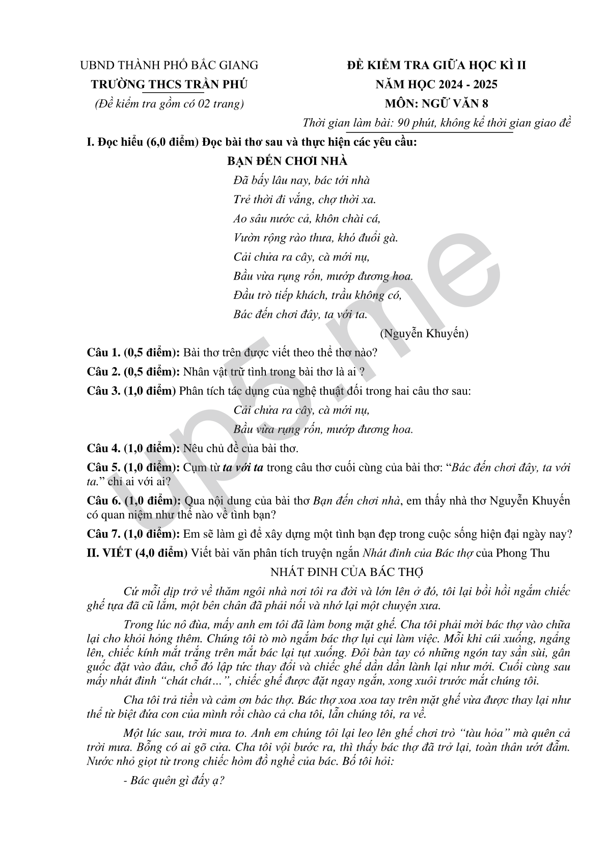 | UBND THÀNH PHỐ BẮC GIANGTRƯỜNG THCS TRẦN PHÚ(Đề kiểm tra gồm có 02 trang) | ĐỀ KIỂM TRA GIỮA HỌC KÌ IINĂM HỌC 2024 - 2025MÔN: NGỮ VĂN 8Thời gian làm bài: 90 phút, không kể thời gian giao đề |