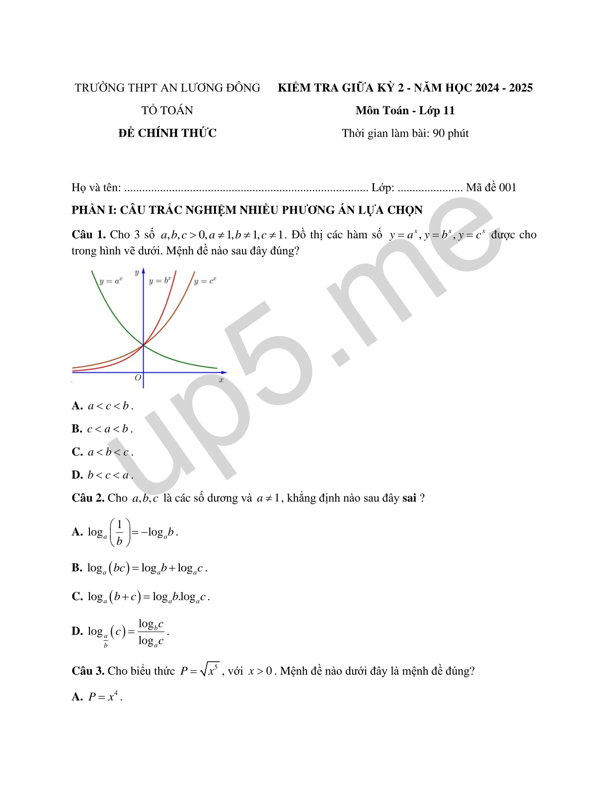 | TRƯỜNG THPT AN LƯƠNG ĐÔNGTỔ TOÁNĐỀ CHÍNH THỨC | KIỂM TRA GIỮA KỲ 2 - NĂM HỌC 2024 - 2025Môn Toán - Lớp 11Thời gian làm bài: 90 phút |