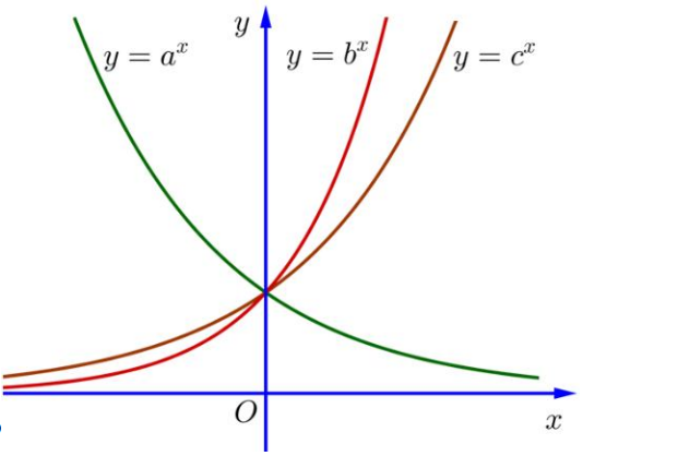Câu 1. Cho 3 số $a,b,c > 0,a \neq 1,b \neq 1,c \neq 1$. Đồ thị các hàm số $y = a^{x},y = b^{x},y = c^{x}$ được cho trong hình vẽ dưới. Mệnh đề nào sau đây đúng?