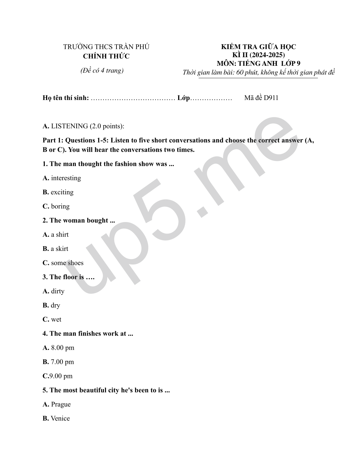 KIỂM TRA GIỮA HỌC KÌ II (2024-2025)MÔN: TIẾNG ANH LỚP 9Thời gian làm bài: 60 phút, không kể thời gian phát đề |