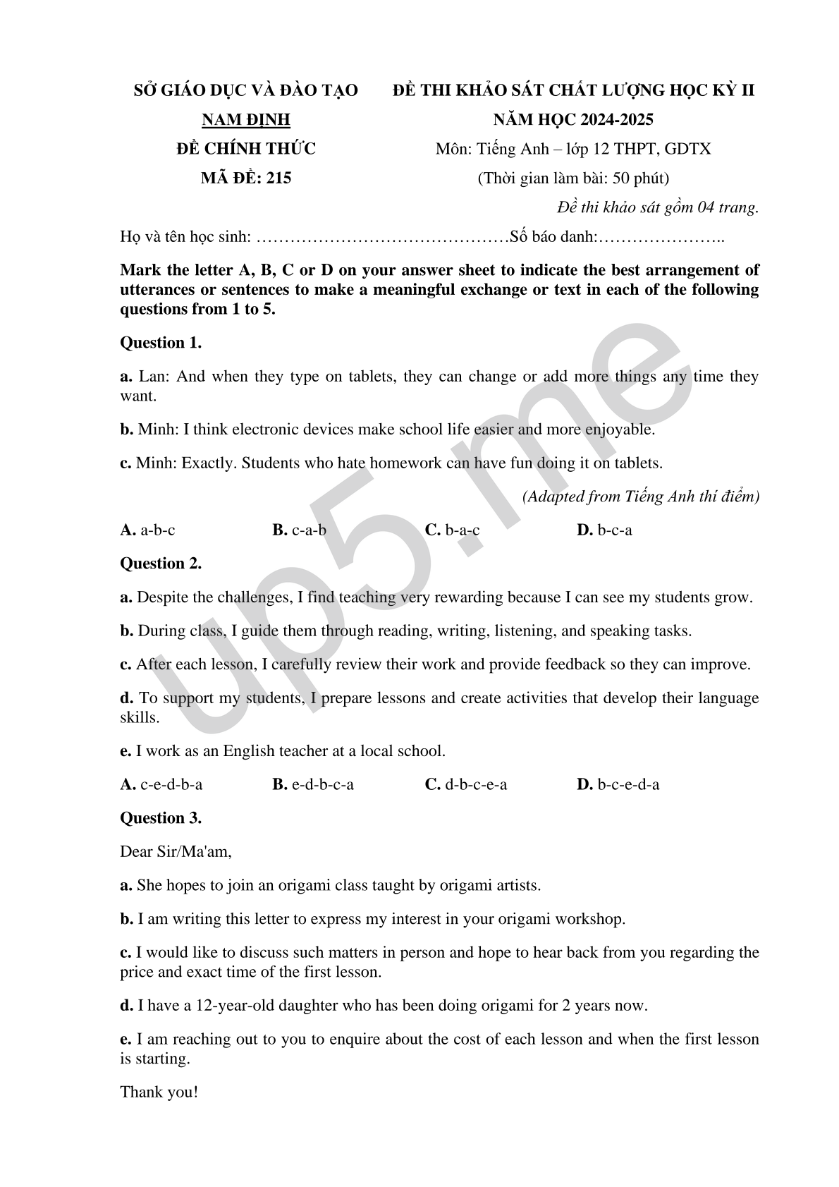 | SỞ GIÁO DỤC VÀ ĐÀO TẠO NAM ĐỊNHĐỀ CHÍNH THỨCMÃ ĐỀ: 215 | ĐỀ THI KHẢO SÁT CHẤT LƯỢNG HỌC KỲ IINĂM HỌC 2024-2025Môn: Tiếng Anh – lớp 12 THPT, GDTX(Thời gian làm bài: 50 phút)Đề thi khảo sát gồm 04 trang. |