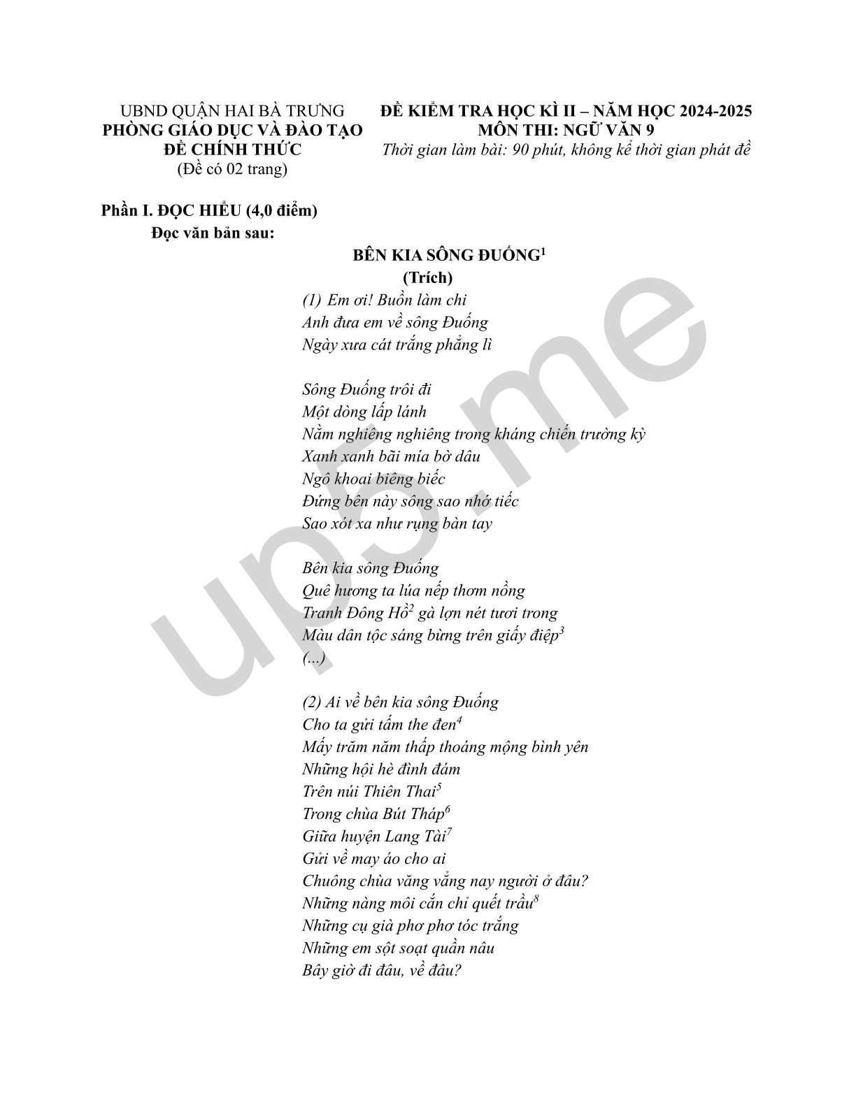 | UBND QUẬN HAI BÀ TRƯNGPHÒNG GIÁO DỤC VÀ ĐÀO TẠOĐỀ CHÍNH THỨC(Đề có 02 trang) | ĐỀ KIỂM TRA HỌC KÌ II – NĂM HỌC 2024-2025MÔN THI: NGỮ VĂN 9Thời gian làm bài: 90 phút, không kể thời gian phát đề |