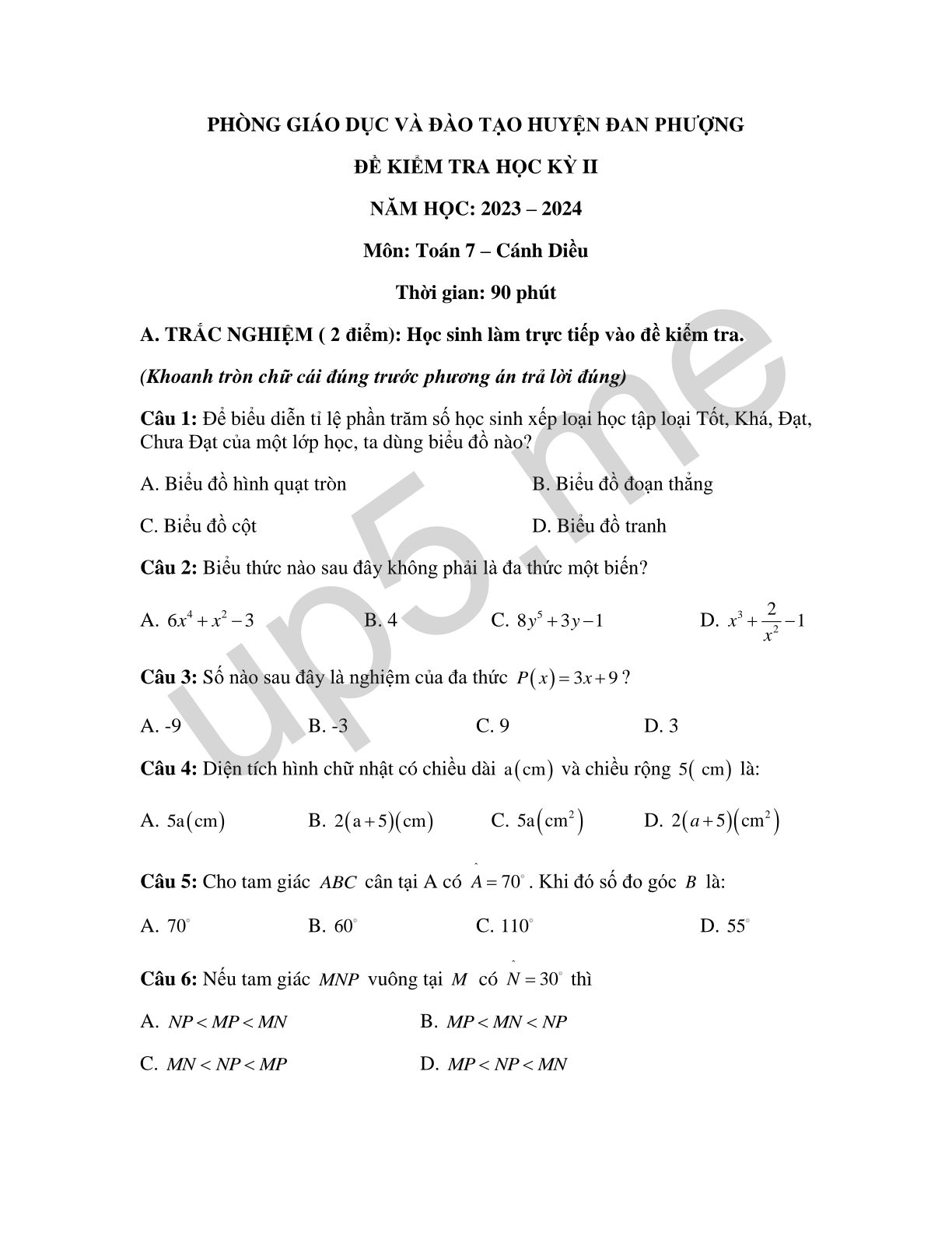 A. TRẮC NGHIỆM ( 2 điểm): Học sinh làm trực tiếp vào đề kiểm tra.