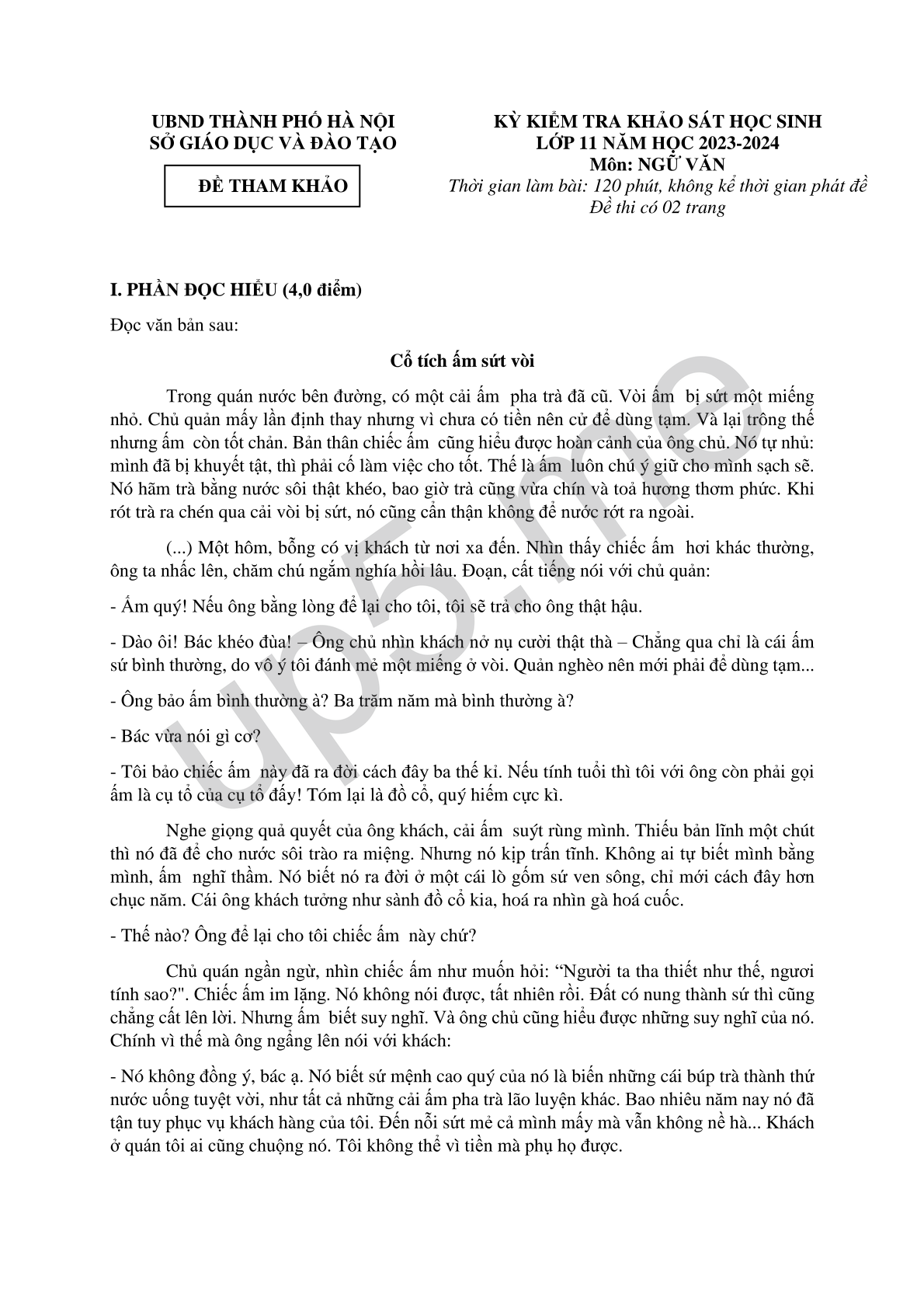 KỲ KIỂM TRA KHẢO SÁT HỌC SINHLỚP 11 NĂM HỌC 2023-2024Môn: NGỮ VĂNThời gian làm bài: 120 phút, không kể thời gian phát đềĐề thi có 02 trang |
