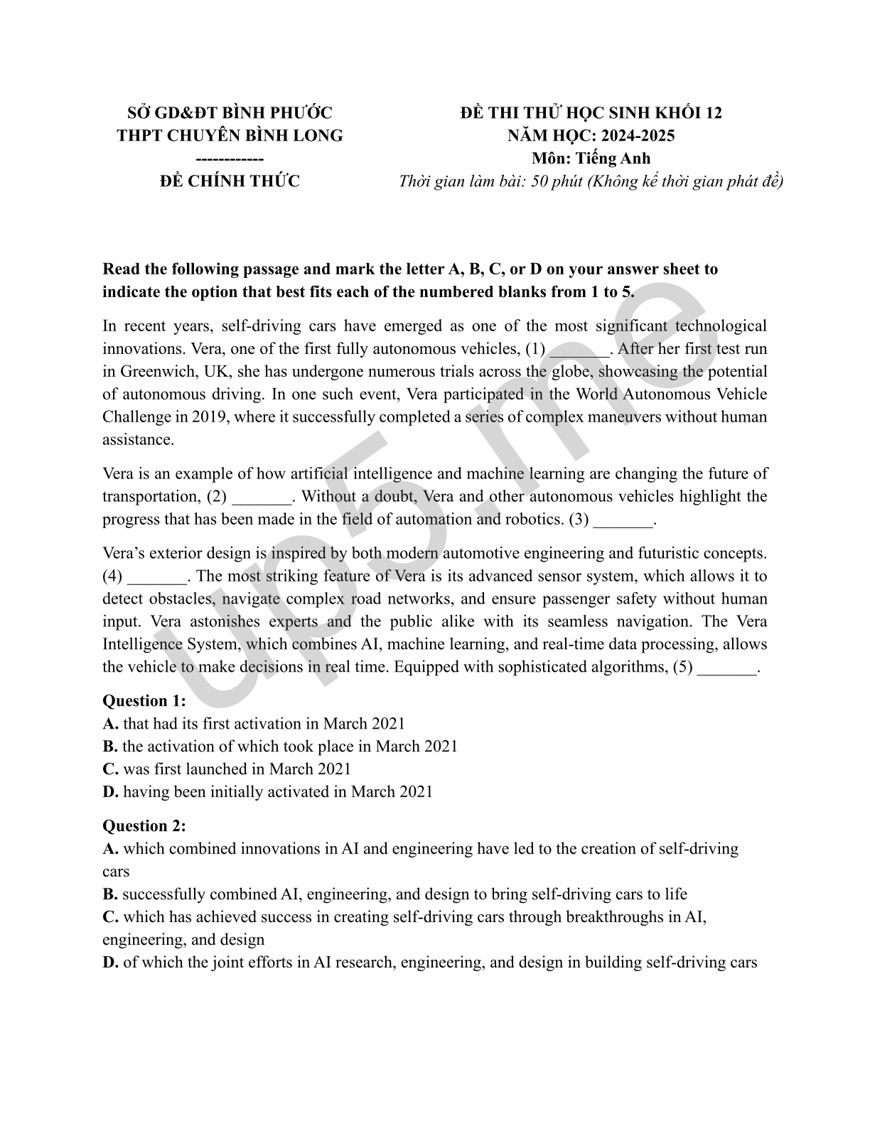 ĐỀ THI THỬ HỌC SINH KHỐI 12 NĂM HỌC: 2024-2025 Môn: Tiếng Anh Thời gian làm bài: 50 phút (Không kể thời gian phát đề) |