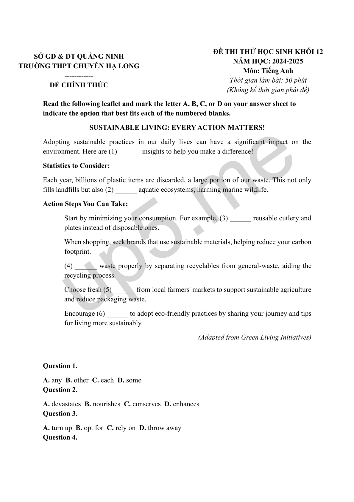 ĐỀ THI THỬ HỌC SINH KHỐI 12 NĂM HỌC: 2024-2025 Môn: Tiếng Anh Thời gian làm bài: 50 phút (Không kể thời gian phát đề) |