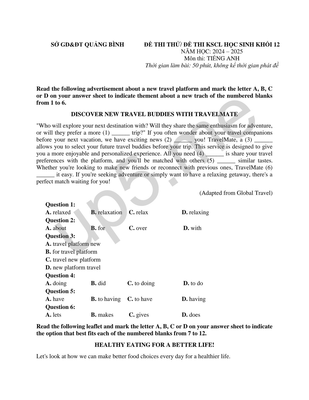 | SỞ GD&ĐT QUẢNG BÌNH | ĐỀ THI THỬ/ ĐỀ THI KSCL HỌC SINH KHỐI 12 NĂM HỌC: 2024 – 2025 Môn thi: TIẾNG ANH Thời gian làm bài: 50 phút, không kể thời gian phát đề |