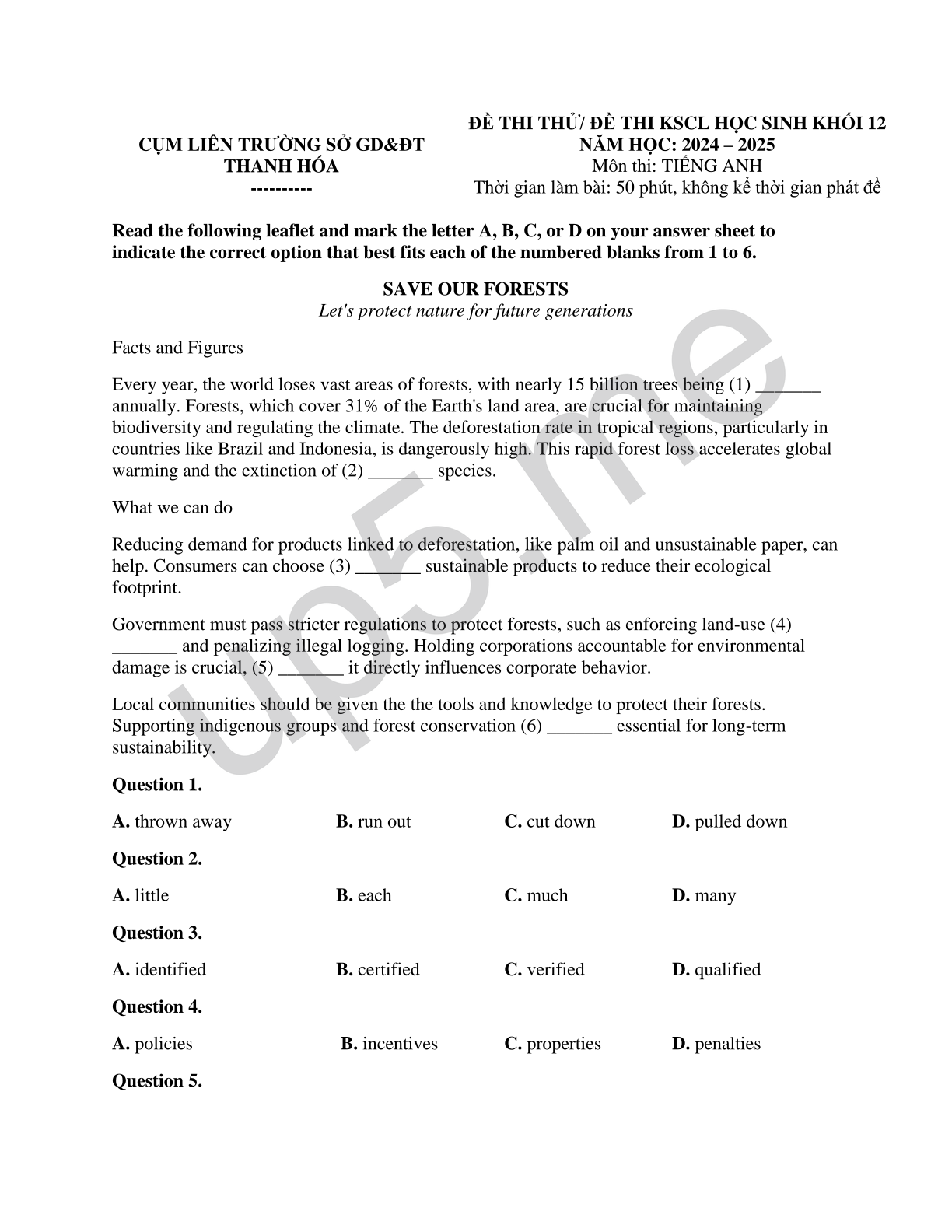 | CỤM LIÊN TRƯỜNG SỞ GD&ĐT THANH HÓA---------- | ĐỀ THI THỬ/ ĐỀ THI KSCL HỌC SINH KHỐI 12NĂM HỌC: 2024 – 2025Môn thi: TIẾNG ANHThời gian làm bài: 50 phút, không kể thời gian phát đề |