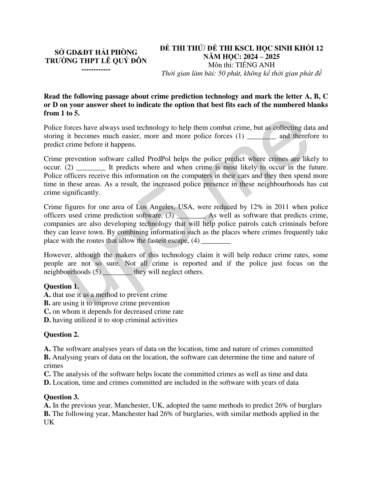ĐỀ THI THỬ/ ĐỀ THI KSCL HỌC SINH KHỐI 12 NĂM HỌC: 2024 – 2025Môn thi: TIẾNG ANHThời gian làm bài: 50 phút, không kể thời gian phát đề |