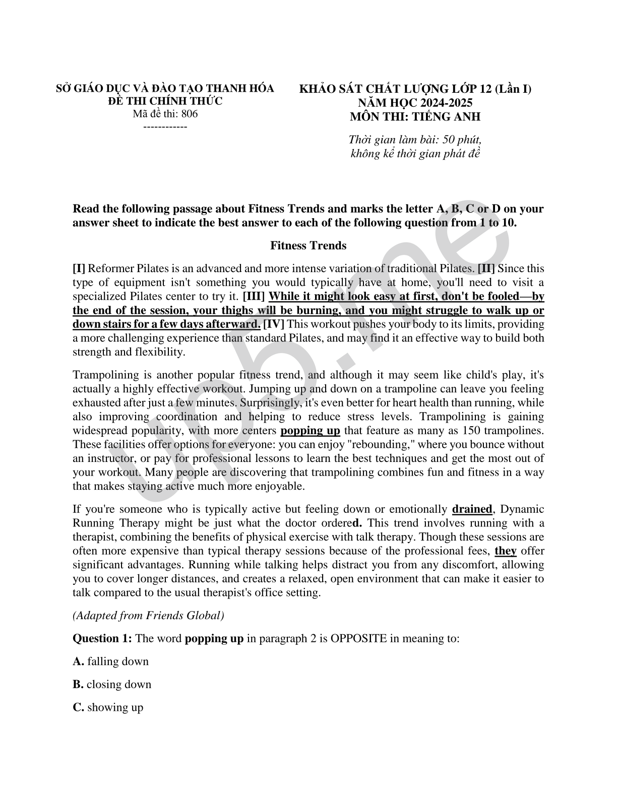 Read the following passage about Fitness Trends and marks the letter A, B, C or D on your answer sheet to indicate the best answer to each of the following question from 1 to 10.