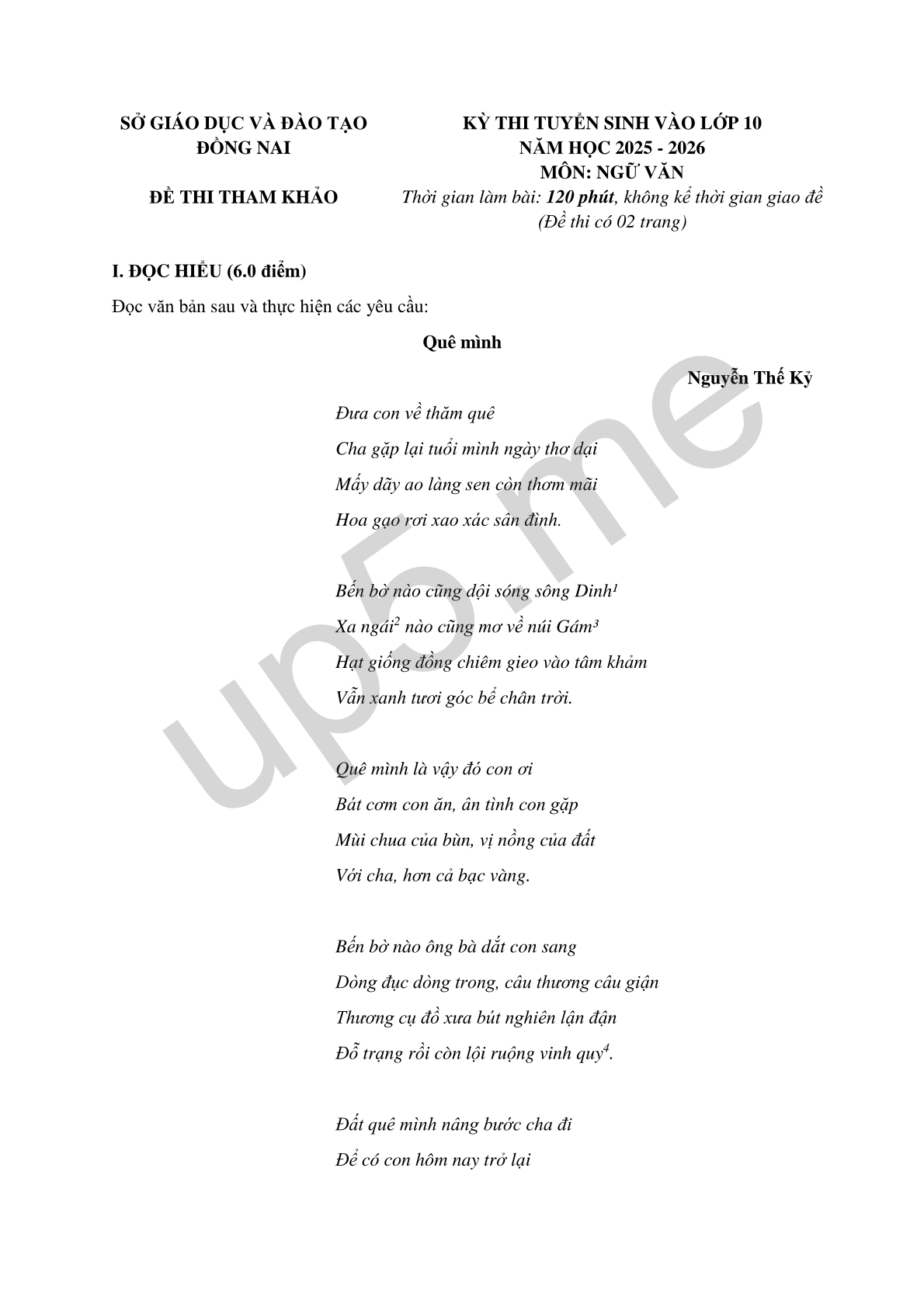 KỲ THI TUYỂN SINH VÀO LỚP 10 NĂM HỌC 2025 - 2026 MÔN: NGỮ VĂN Thời gian làm bài: 120 phút, không kể thời gian giao đề (Đề thi có 02 trang) |