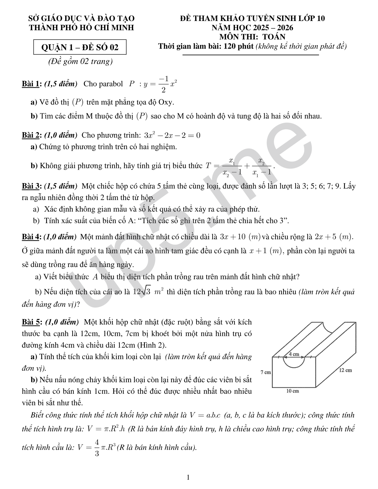 SỞ GIÁO DỤC VÀ ĐÀO TẠO THÀNH PHỐ HỒ CHÍ MINH (Đề gồm 02 trang) QUẬN 1 – ĐỀ SỐ 02 |