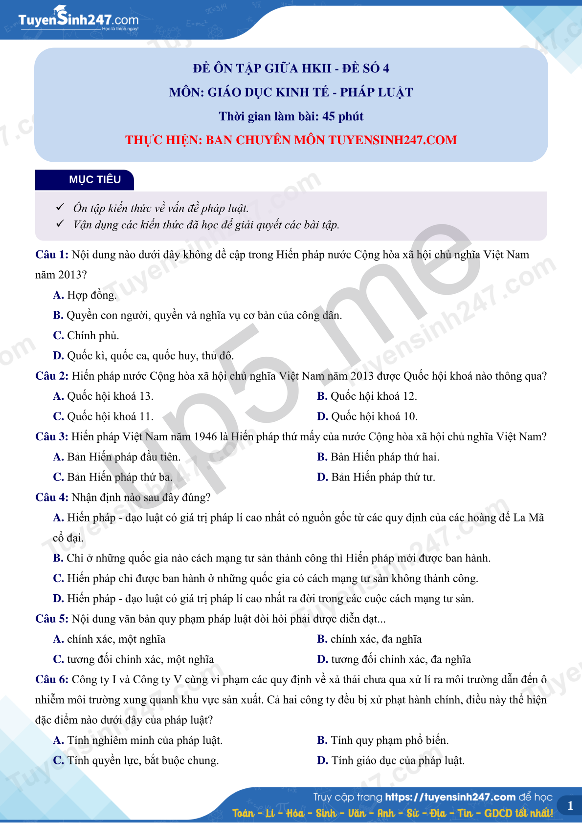 MÔN: GIÁO DỤC KINH TẾ - PHÁP LUẬT