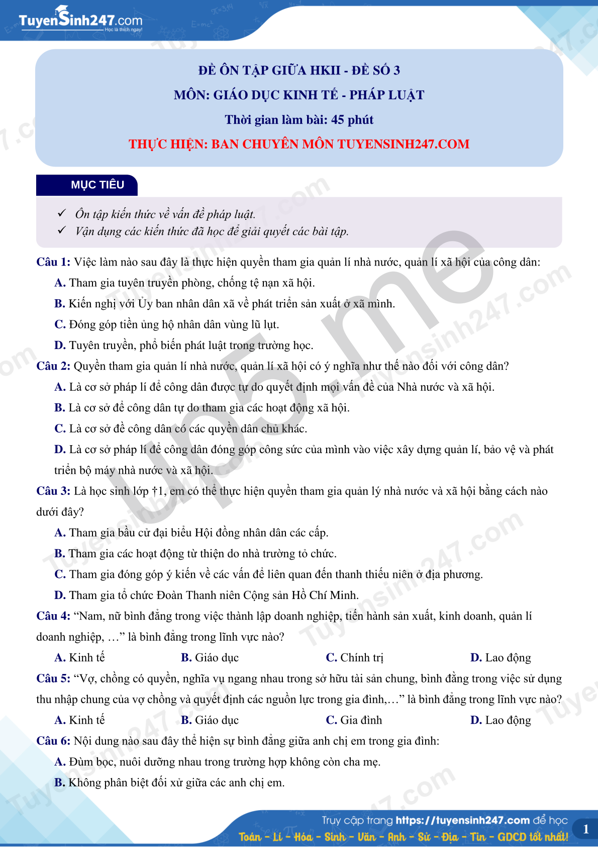 MÔN: GIÁO DỤC KINH TẾ - PHÁP LUẬT