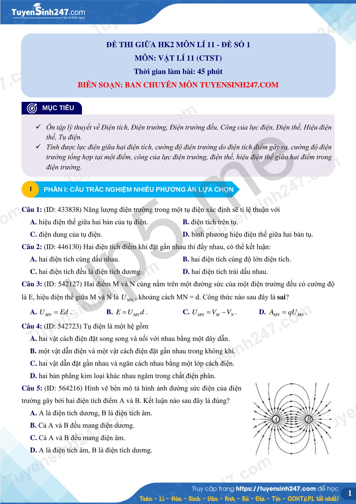 ĐỀ THI GIỮA HK2 MÔN LÍ 11 - ĐỀ SỐ 1