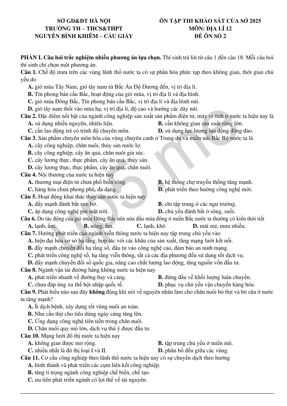 | SỞ GD&ĐT HÀ NỘITRƯỜNG TH – THCS&THPT NGUYỄN BỈNH KHIÊM – CẦU GIẤY | ÔN TẬP THI KHẢO SÁT CỦA SỞ 2025MÔN: ĐỊA LÍ 12ĐỀ ÔN SỐ 2 |