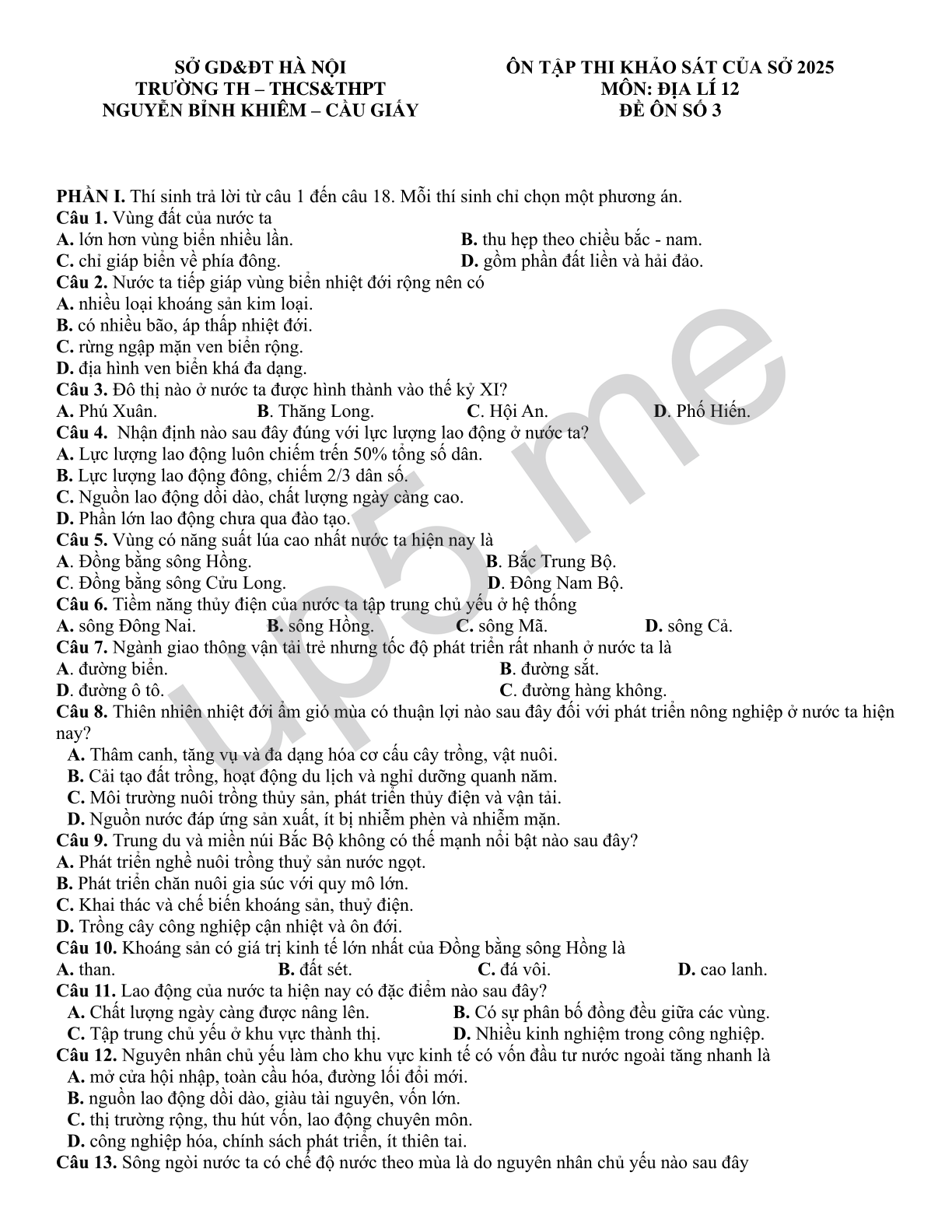 | SỞ GD&ĐT HÀ NỘITRƯỜNG TH – THCS&THPT NGUYỄN BỈNH KHIÊM – CẦU GIẤY | ÔN TẬP THI KHẢO SÁT CỦA SỞ 2025MÔN: ĐỊA LÍ 12ĐỀ ÔN SỐ 3 |