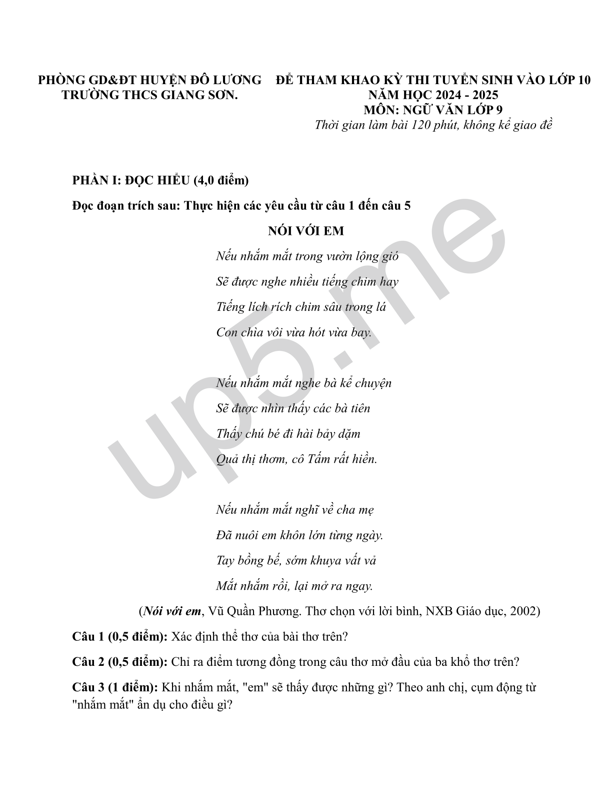| PHÒNG GD&ĐT HUYỆN ĐÔ LƯƠNGTRƯỜNG THCS GIANG SƠN. | ĐỂ THAM KHAO KỲ THI TUYỂN SINH VÀO LỚP 10 NĂM HỌC 2024 - 2025MÔN: NGỮ VĂN LỚP 9Thời gian làm bài 120 phút, không kể giao đề |