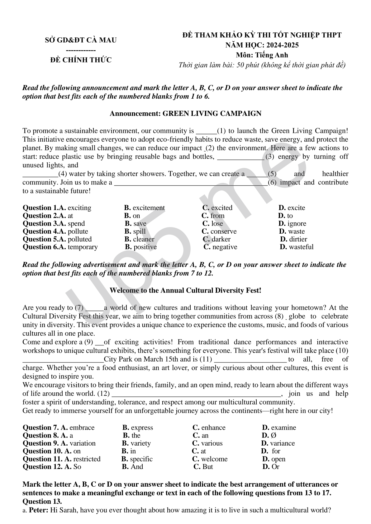 ĐỀ THAM KHẢO KỲ THI TỐT NGHIỆP THPT NĂM HỌC: 2024-2025 Môn: Tiếng Anh Thời gian làm bài: 50 phút (không kể thời gian phát đề) |