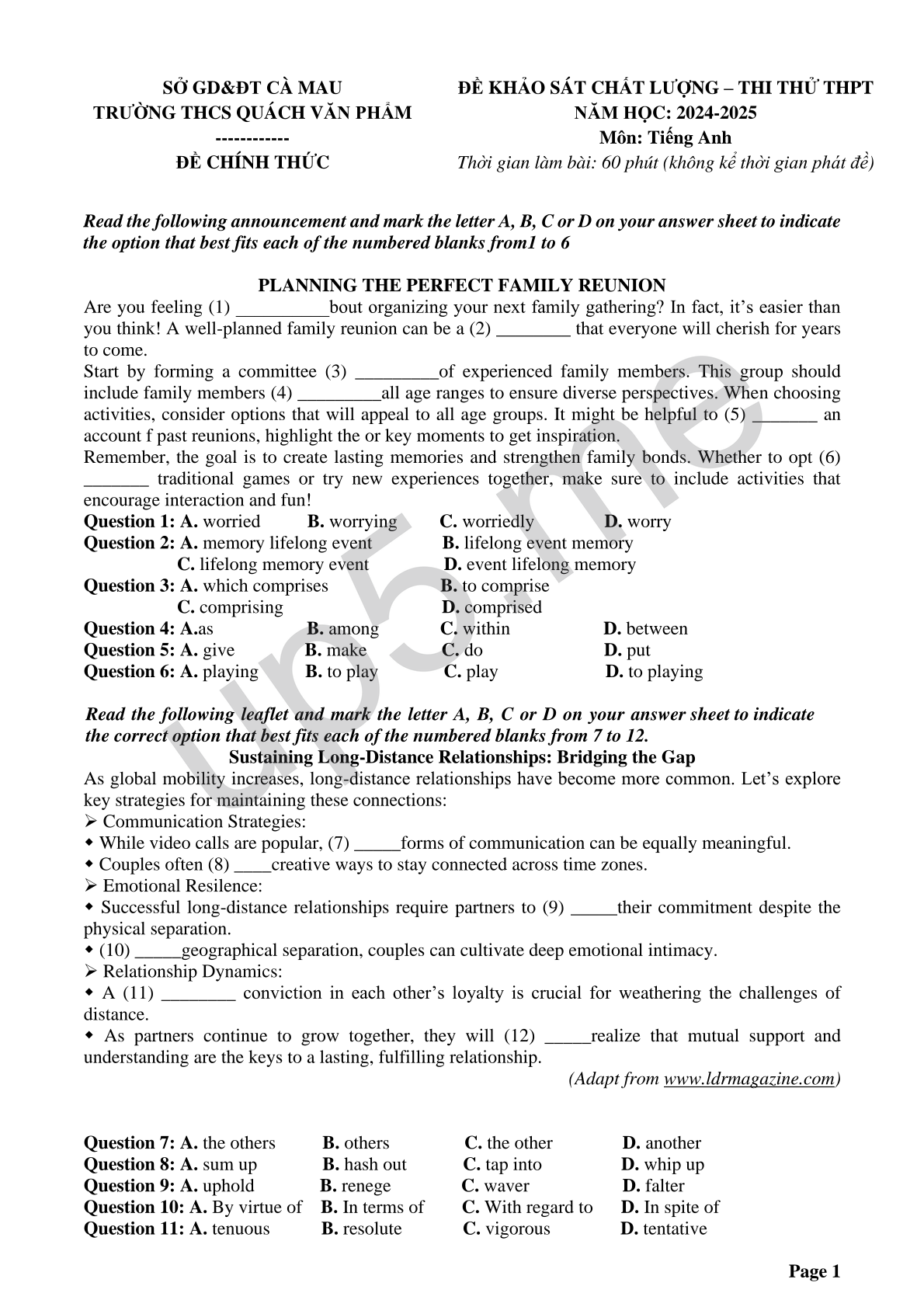 ĐỀ KHẢO SÁT CHẤT LƯỢNG – THI THỬ THPT NĂM HỌC: 2024-2025 Môn: Tiếng Anh Thời gian làm bài: 60 phút (không kể thời gian phát đề) |