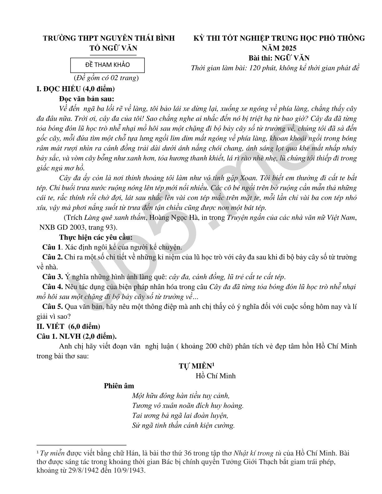TRƯỜNG THPT NGUYỄN THÁI BÌNH TỔ NGỮ VĂN ĐỀ THAM KHẢO (Đề gồm có 02 trang) |