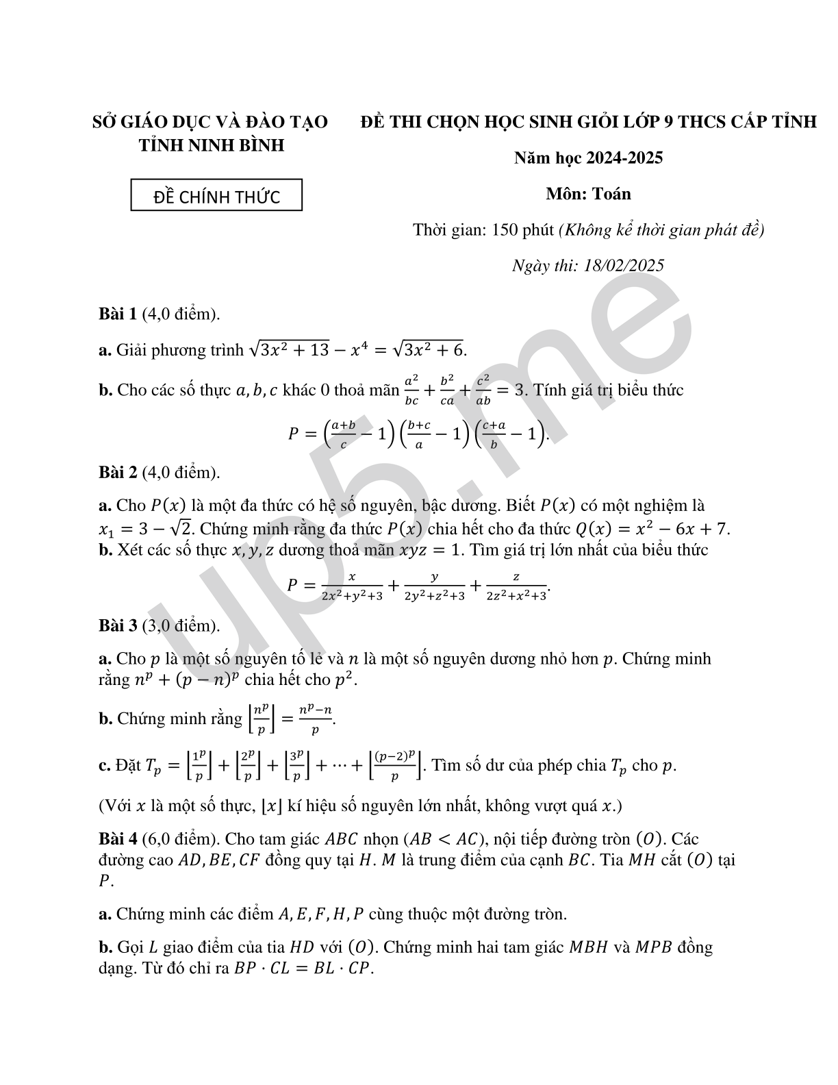 ĐỀ THI CHỌN HỌC SINH GIỎI LỚP 9 THCS CẤP TỈNH Năm học 2024-2025 Môn: Toán Thời gian: 150 phút (Không kể thời gian phát đề) Ngày thi: 18/02/2025 |