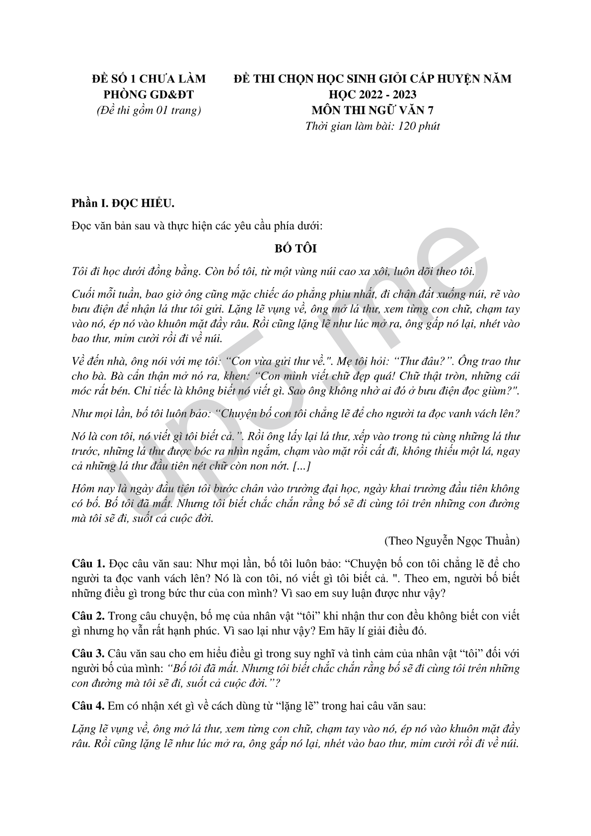 ĐỀ THI CHỌN HỌC SINH GIỎI CẤP HUYỆN NĂMHỌC 2022 - 2023MÔN THI NGỮ VĂN 7Thời gian làm bài: 120 phút |