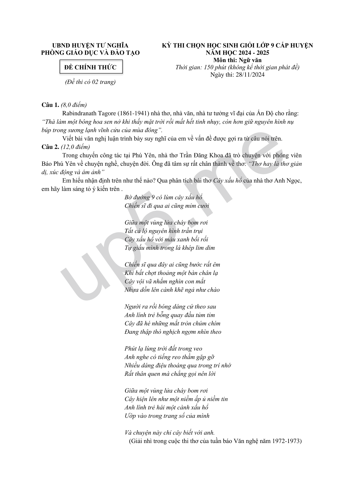 KỲ THI CHỌN HỌC SINH GIỎI LỚP 9 CẤP HUYỆN NĂM HỌC 2024 - 2025 Môn thi: Ngữ văn Thời gian: 150 phút (không kể thời gian phát đề)Ngày thi: 28/11/2024 |