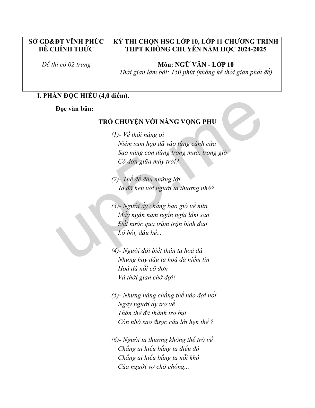 | SỞ GD&ĐT VĨNH PHÚC ĐỀ CHÍNH THỨCĐề thi có 02 trang | KỲ THI CHỌN HSG LỚP 10, LỚP 11 CHƯƠNG TRÌNH THPT KHÔNG CHUYÊN NĂM HỌC 2024-2025Môn: NGỮ VĂN - LỚP 10Thời gian làm bài: 150 phút (không kể thời gian phát đề) |