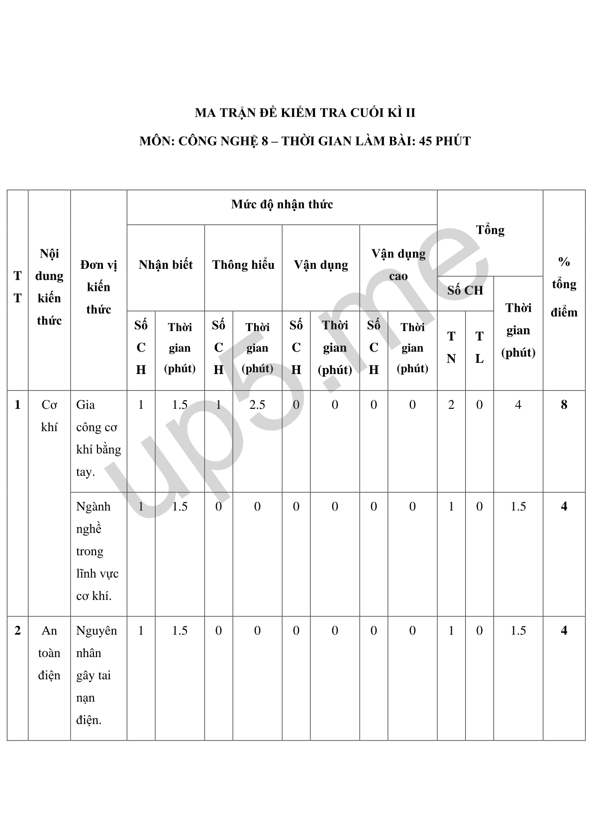 MÔN: CÔNG NGHỆ 8 – THỜI GIAN LÀM BÀI: 45 PHÚT