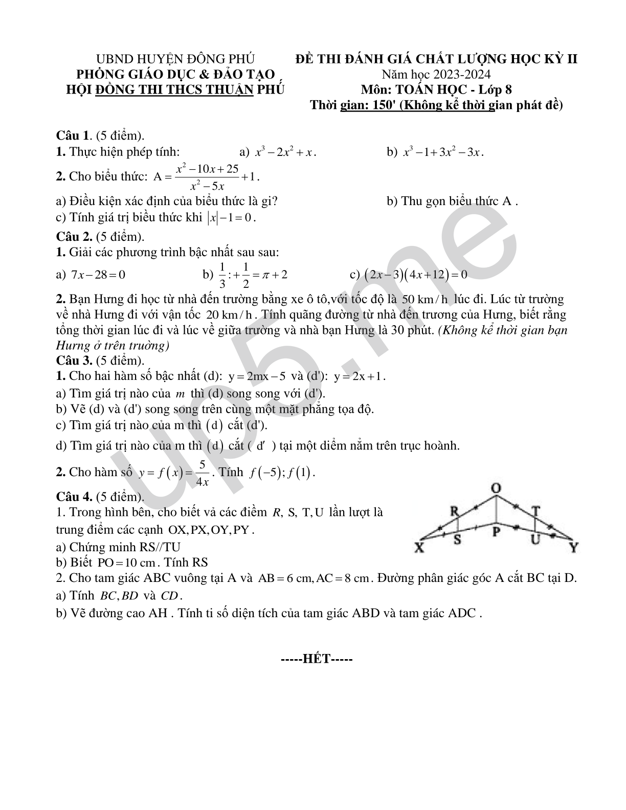 ĐỀ THI ĐÁNH GIÁ CHẤT LƯỢNG HỌC KỲ II Năm học 2023-2024 Môn: TOÁN HỌC - Lớp 8 Thời gian: 150' (Không kể thời gian phát đề) |
