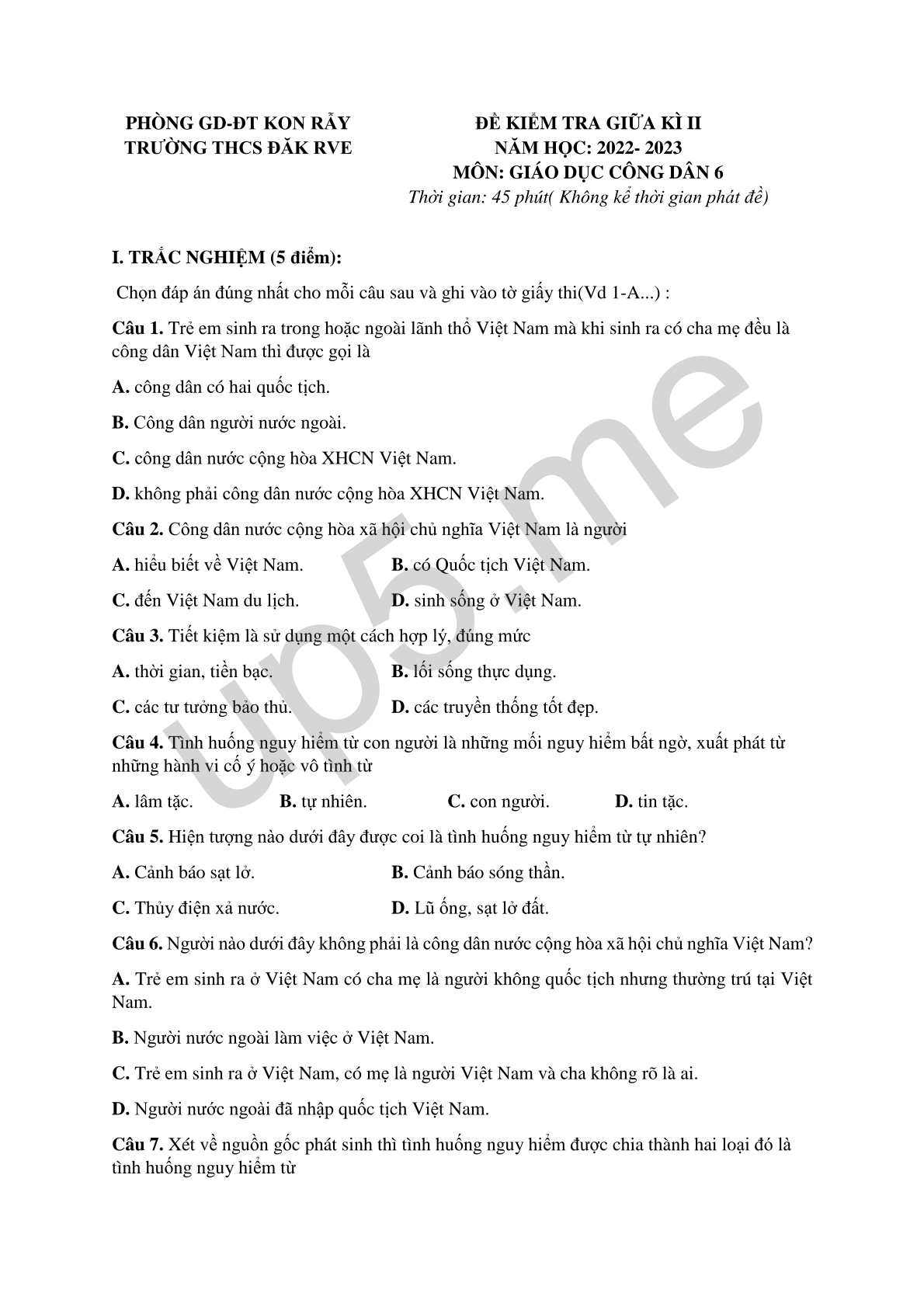 ĐỀ KIỂM TRA GIỮA KÌ II NĂM HỌC: 2022- 2023 MÔN: GIÁO DỤC CÔNG DÂN 6 Thời gian: 45 phút( Không kể thời gian phát đề) |